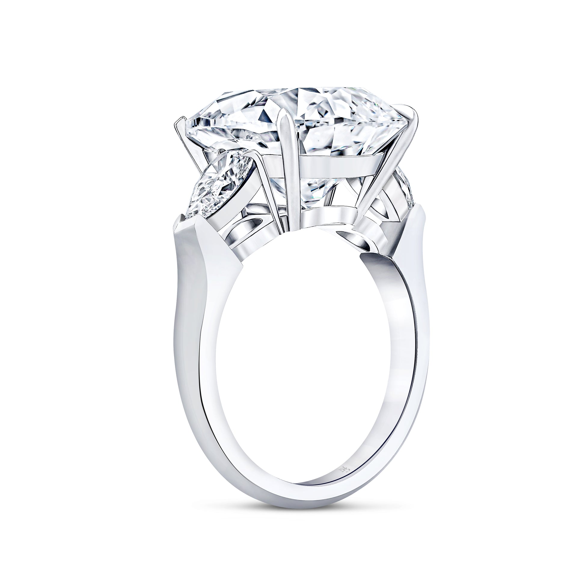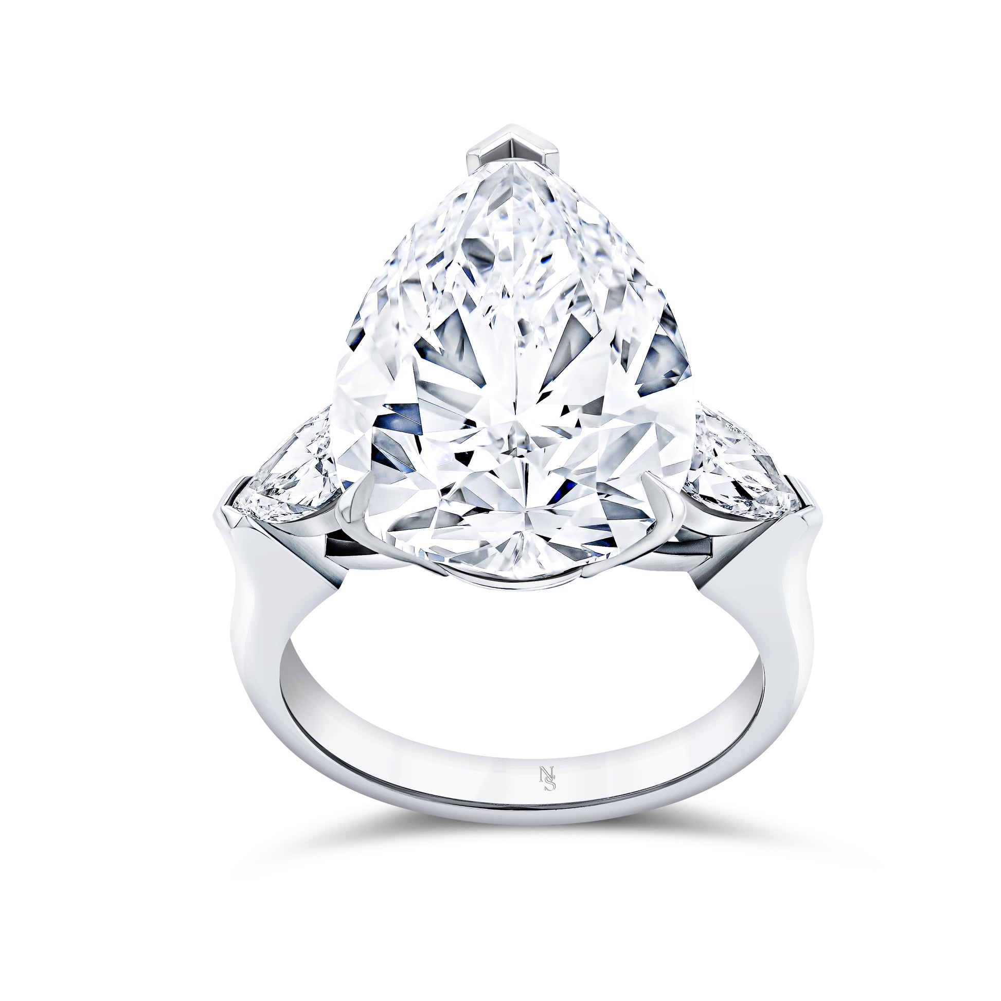 This three-stone ring features an 11.42 carat pear-shaped diamond at the center, accented by pear-shaped side stones totaling 0.94 carats. Set in platinum, it offers a striking blend of brilliance, symmetry, and refined craftsmanship.