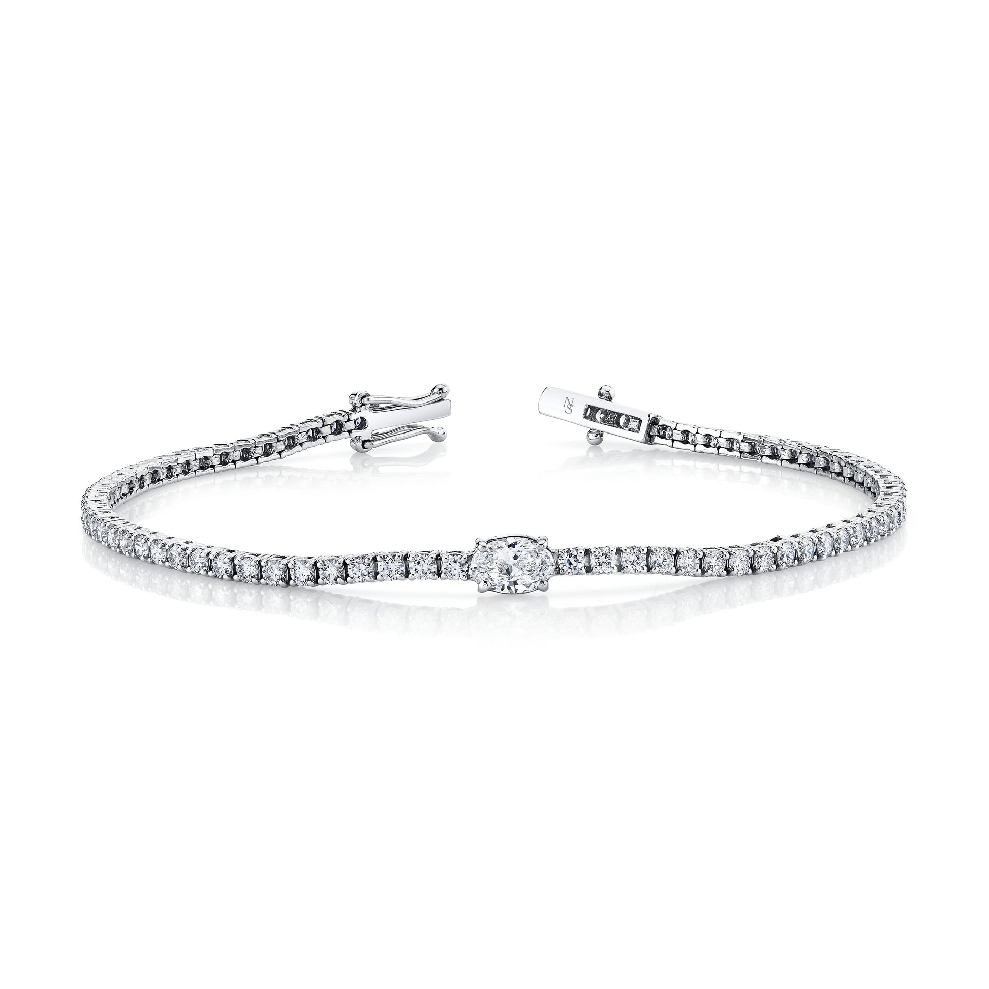This bracelet features a classic straight-line design with a stunning larger oval center diamond. Its timeless elegance adds a perfect touch of sophistication to any outfit. Available in a variety of metal choices, it's a versatile piece for any occasion.