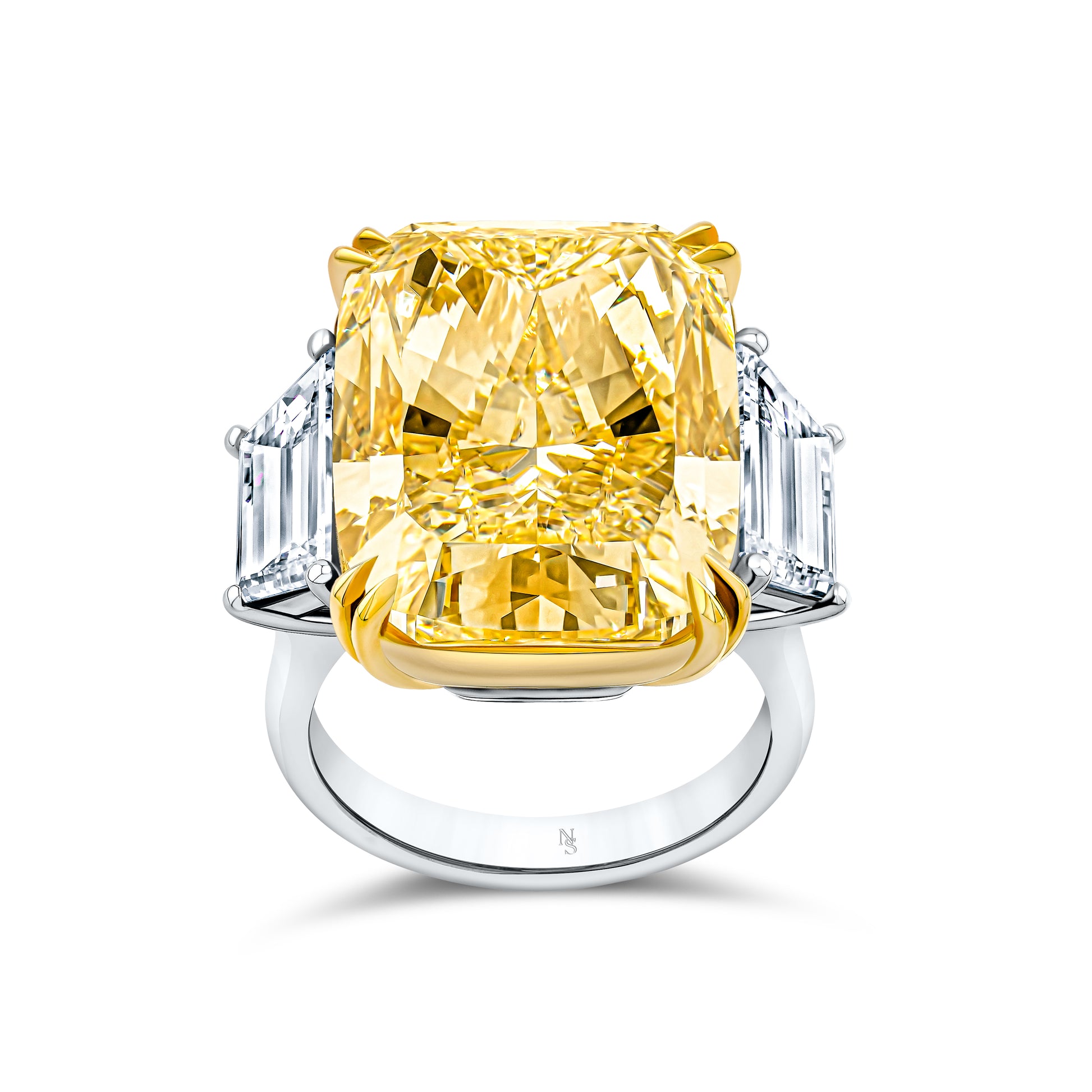 This ring features a 25.12 carat fancy yellow cushion-cut diamond, paired with 3.31 carats of trapezoid-shaped diamonds on either side. A striking blend of vivid color and refined symmetry, crafted for unmistakable presence.