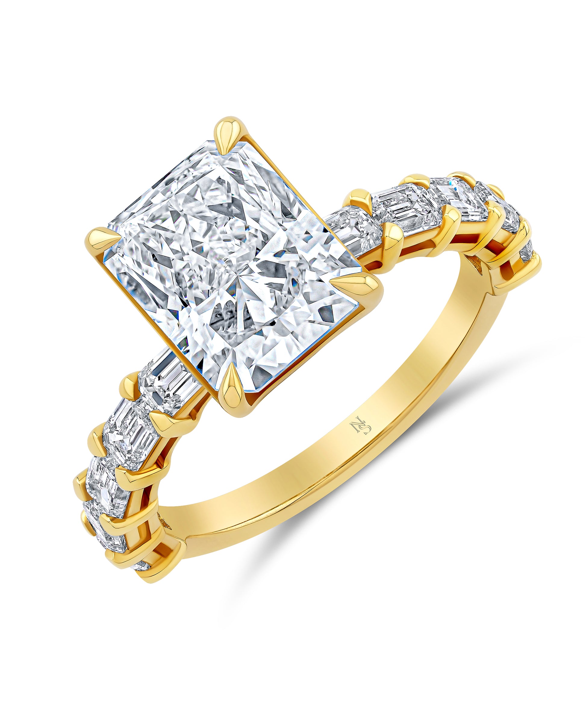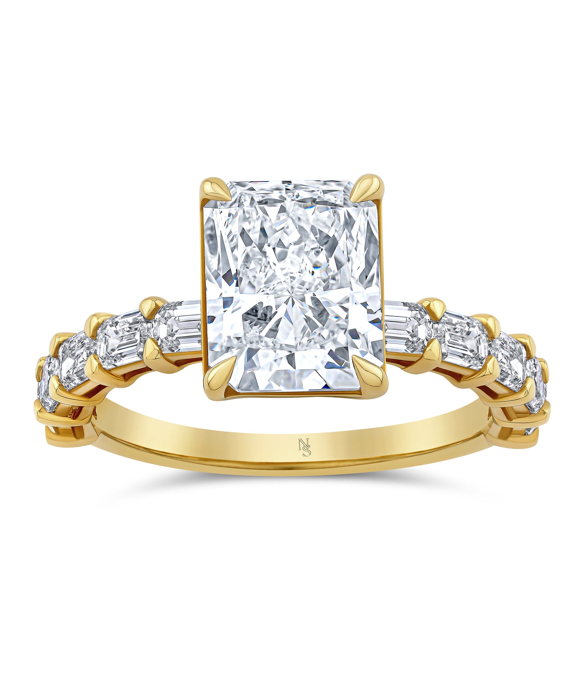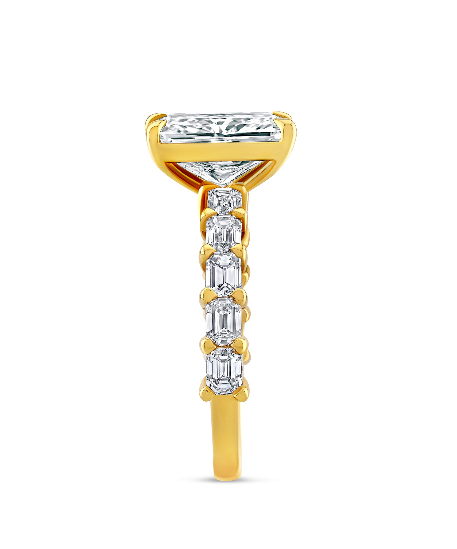 Our 3.14 Carat Radiant Diamond Ring is flanked by ten emerald-cut side stones totaling 1.18 carats, all set in rich 18k yellow gold. A striking balance of bold brilliance and refined detail.