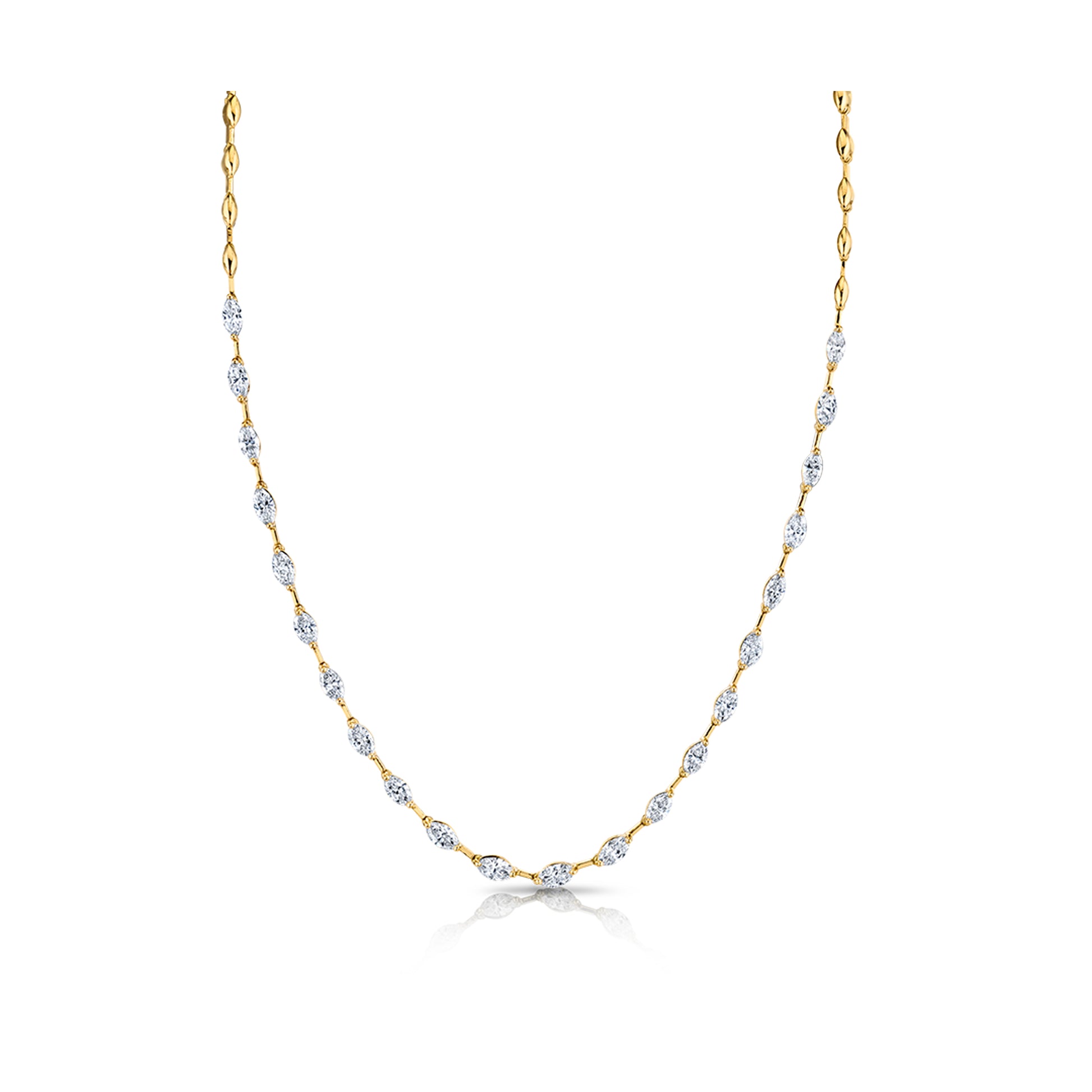 Marquise diamonds set in 18k yellow gold necklace. 22 total stones 4.35 total weight Approximate Color G-H Clarity VS Measures 16 inches in length. Also available in 18k white and rose gold.