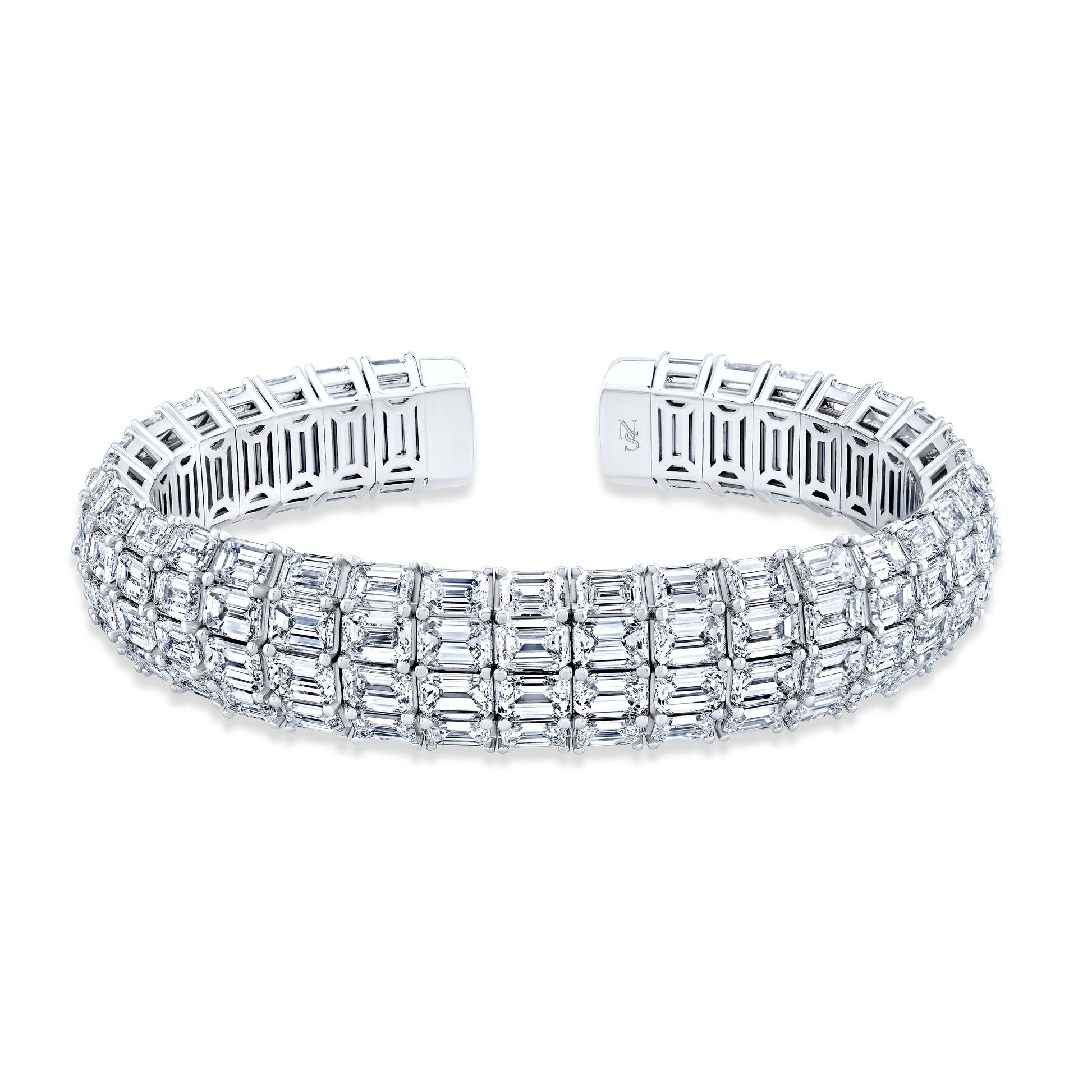 This four-row cuff bracelet showcases 38.48 carats of emerald-cut diamonds set in 18k gold. A bold, architectural design that creates a continuous stream of light across the wrist. Available in 18k white and yellow gold.