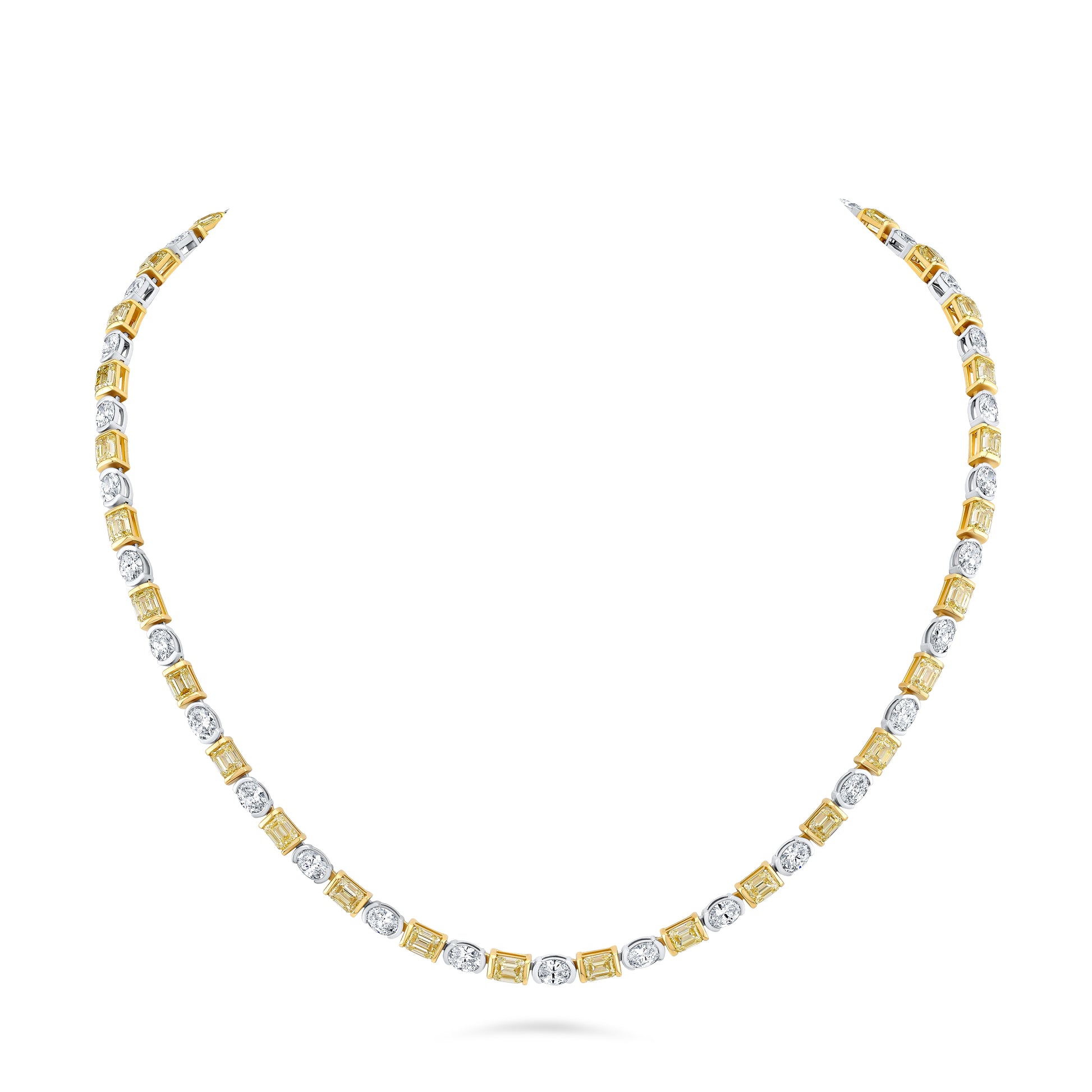 A striking balance of shape and color, this necklace features 20.63 carats of alternating fancy yellow emerald-cut and oval diamonds. Set in a mix of 18K white and yellow gold, the contrast enhances each stone’s brilliance and hue. A bold, elegant piece that captures modern sophistication with timeless charm.