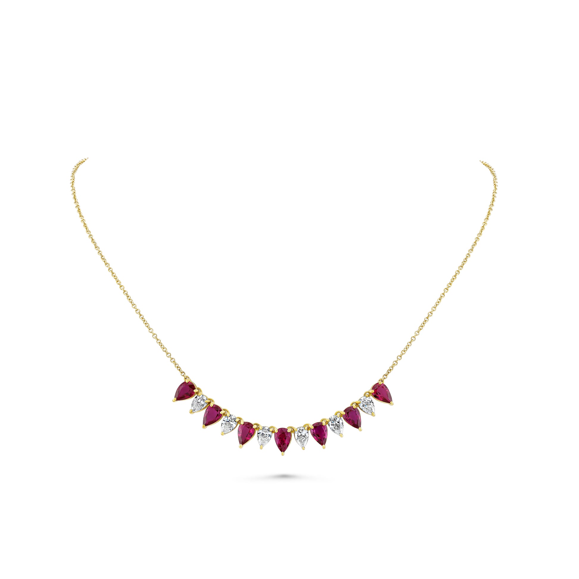 Set in 18K yellow gold, this 16" necklace features 4.92 carats of alternating pear-shaped rubies and diamonds. The vivid red and brilliant white stones create a timeless, elegant contrast—perfect for adding a touch of color and sophistication to any look.