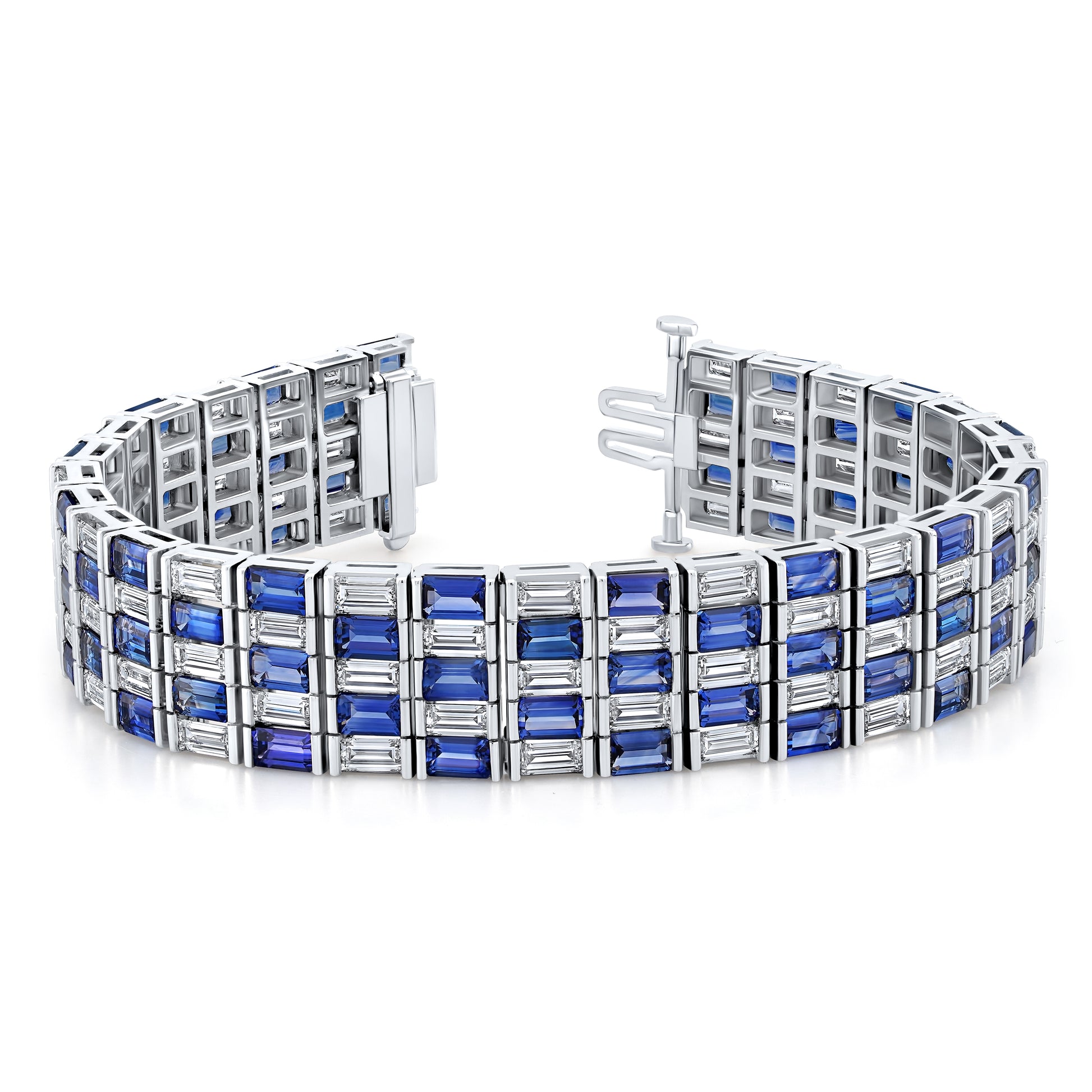 This striking bracelet showcases 36.30 carats of alternating blue sapphires and diamonds, set in five bold rows of 18K white gold. The structured design and vivid contrast create a statement piece with depth, brilliance, and timeless glamour.