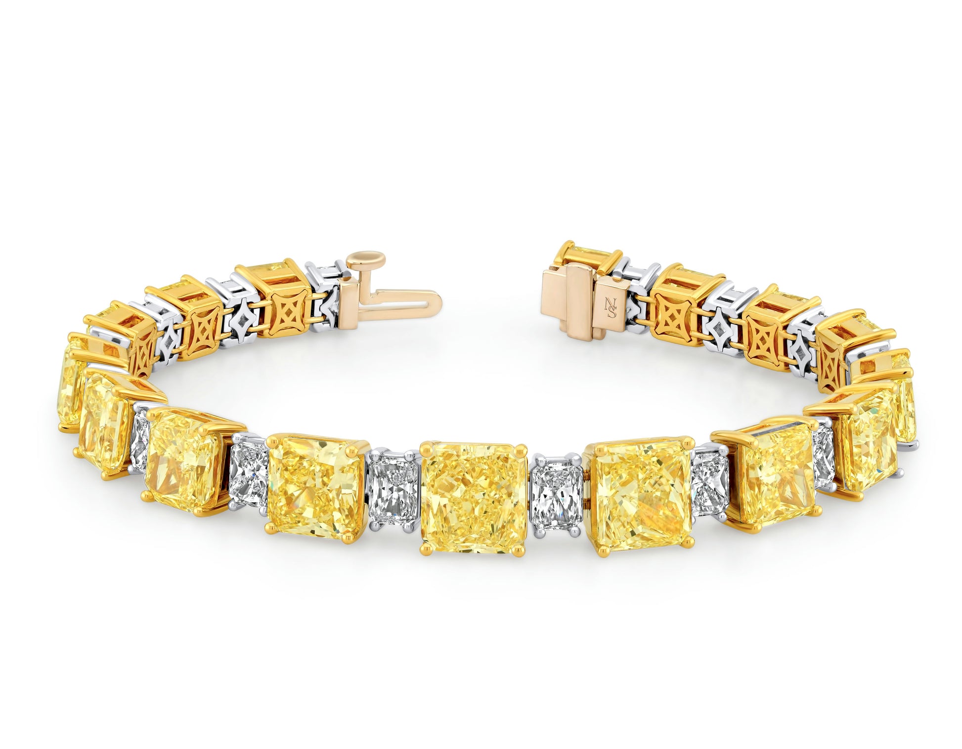 This exquisite bracelet features alternating white and yellow radiant-cut diamonds, set in a sophisticated blend of 18k white gold and 18k yellow gold. Each diamond is certified for quality, ensuring brilliance and luxury. A timeless design that elegantly combines contrasting colors, this radiant diamond bracelet adds an elevated touch of glamour to any jewelry collection.