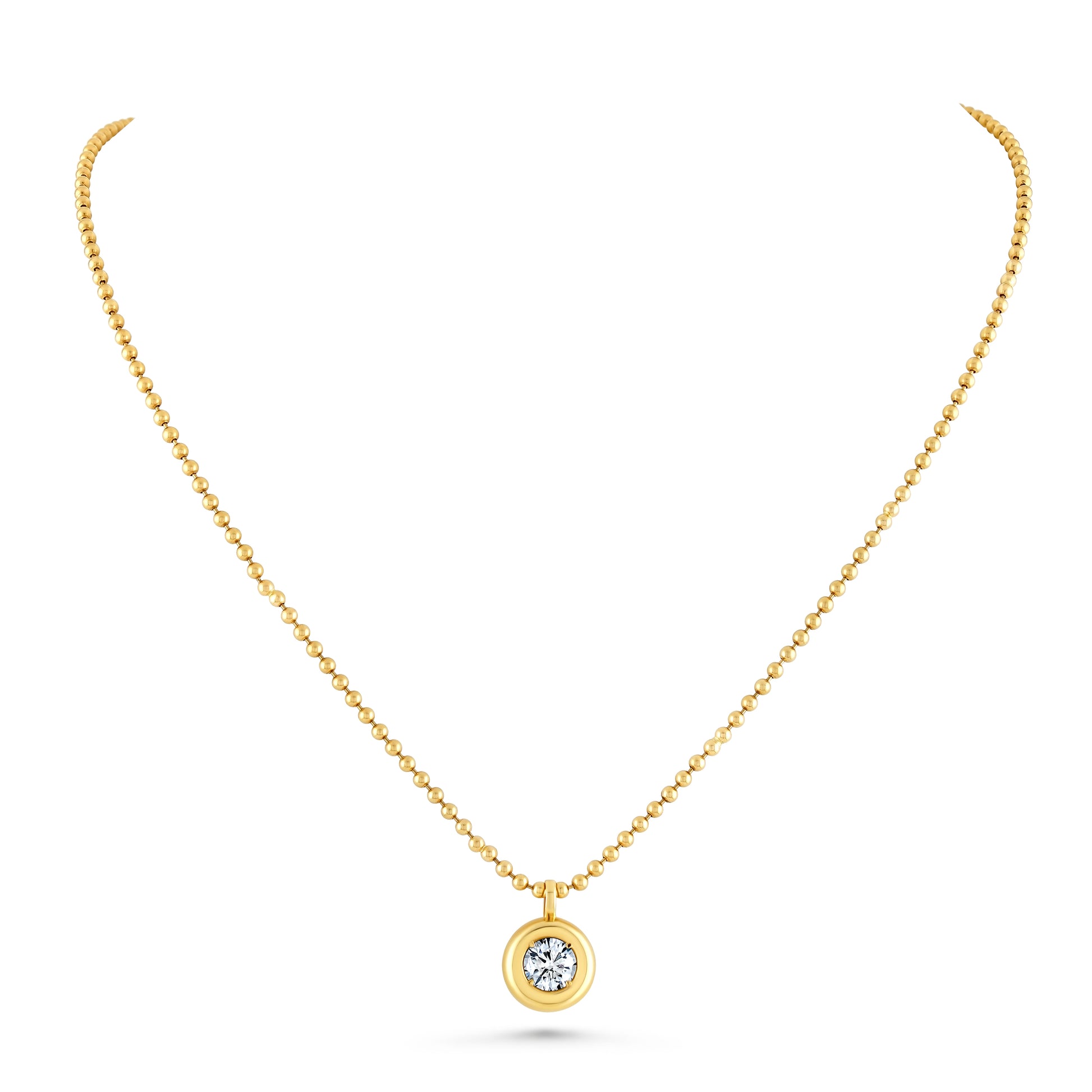 Discover timeless elegance with our Bezel Set Pendant, crafted in luxurious 18k yellow gold. Featuring a stunning 1.01ct diamond, this exquisite piece is perfect for any occasion. Suspended on a delicate 16" bead chain, the pendant offers a refined, understated look that radiates sophistication.