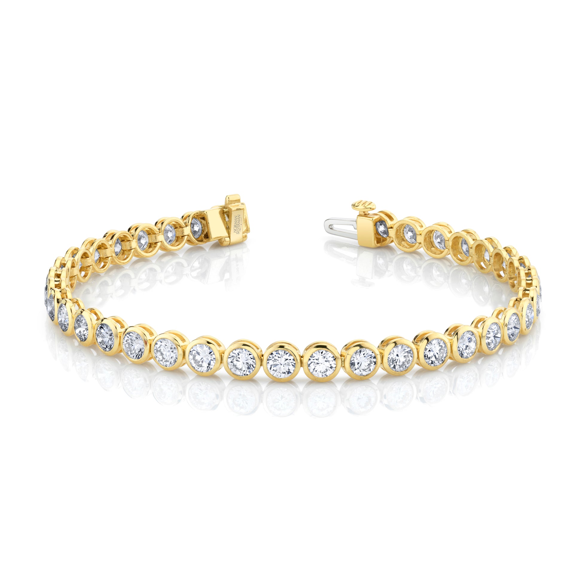 Add a touch of timeless elegance with our Bezel Set Round Bracelet, showcasing over 8 carats of brilliant diamonds set in 18k yellow gold. This classic design offers a sleek, sophisticated look, perfect for elevating any outfit with its subtle yet stunning sparkle.