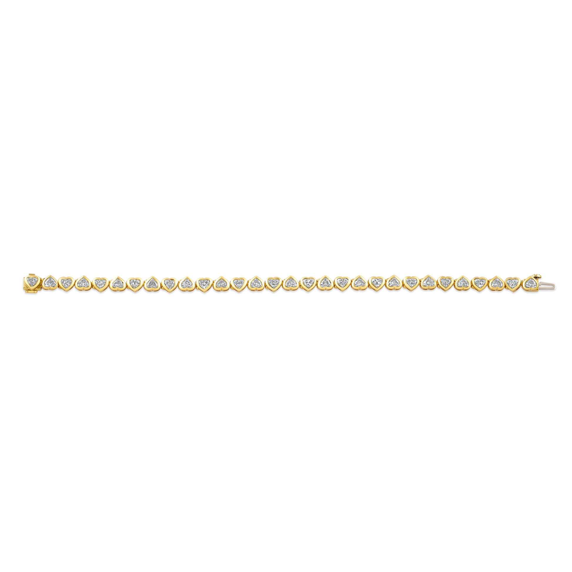 Sparkle with love in our Dancing Diamond Hearts Bezel Set Bracelet, crafted in 18k yellow gold. Featuring a unique alternating design this bracelet adds a playful yet elegant touch to any outfit, making it the perfect gift to celebrate love and special moments. Diamond total weight is approximately 7.5 carats.