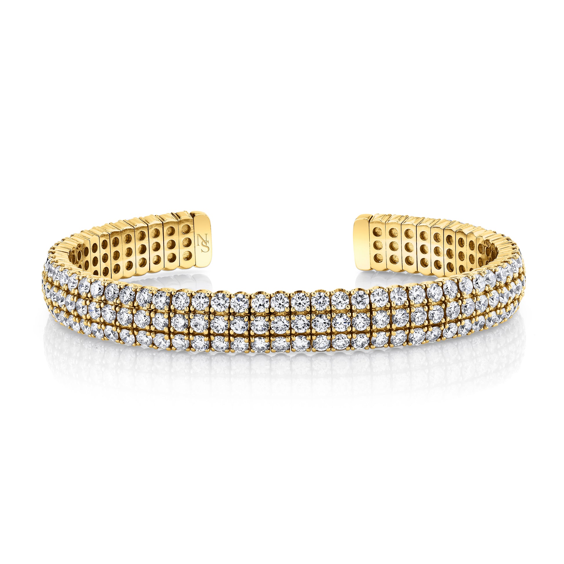 This Diamond Cuff Bracelet showcases three rows of round brilliant diamonds, totaling 11.82 carats, elegantly set in 18k yellow gold. Expertly crafted from the finest materials, this refined piece offers a sophisticated touch of radiance, making it a timeless addition to any ensemble.