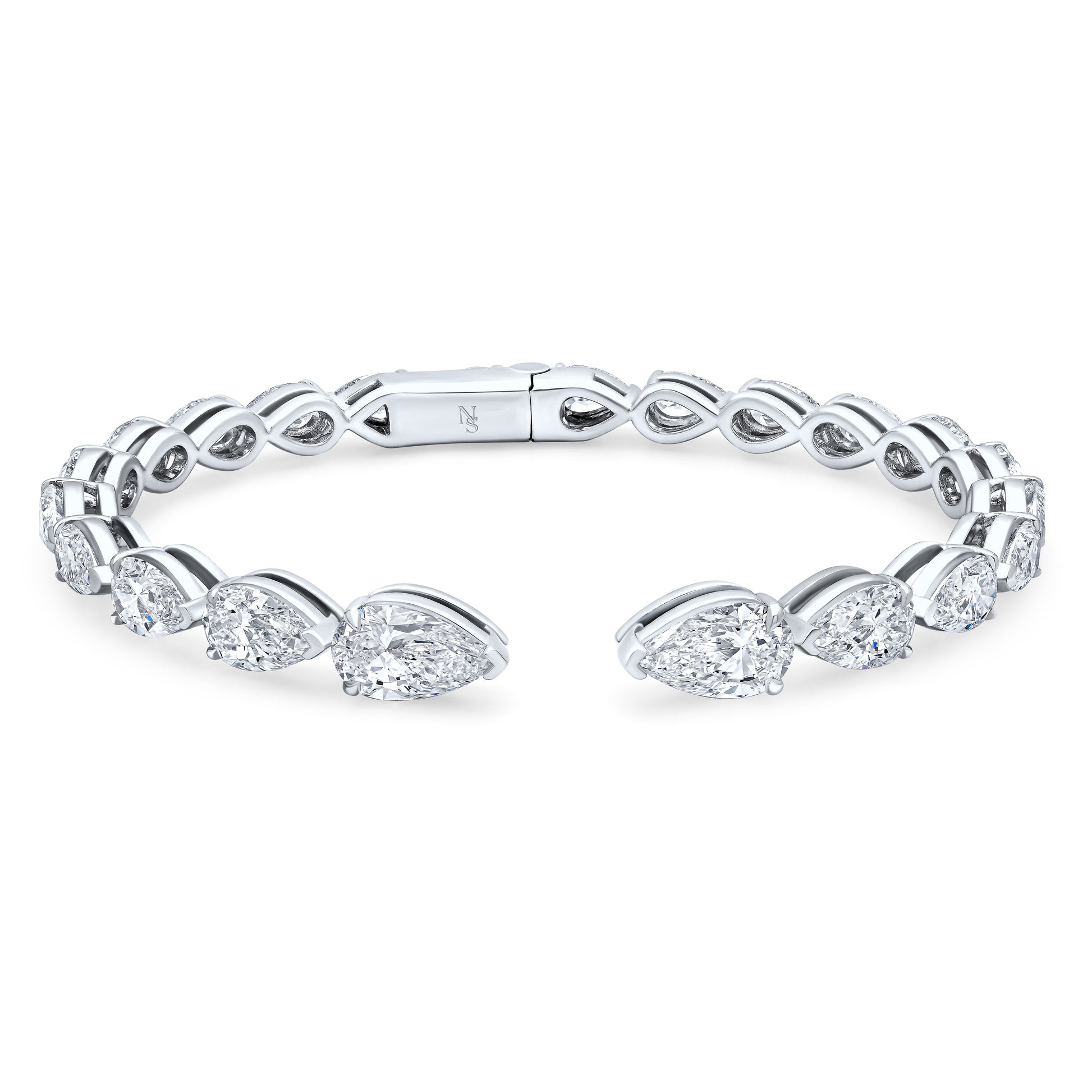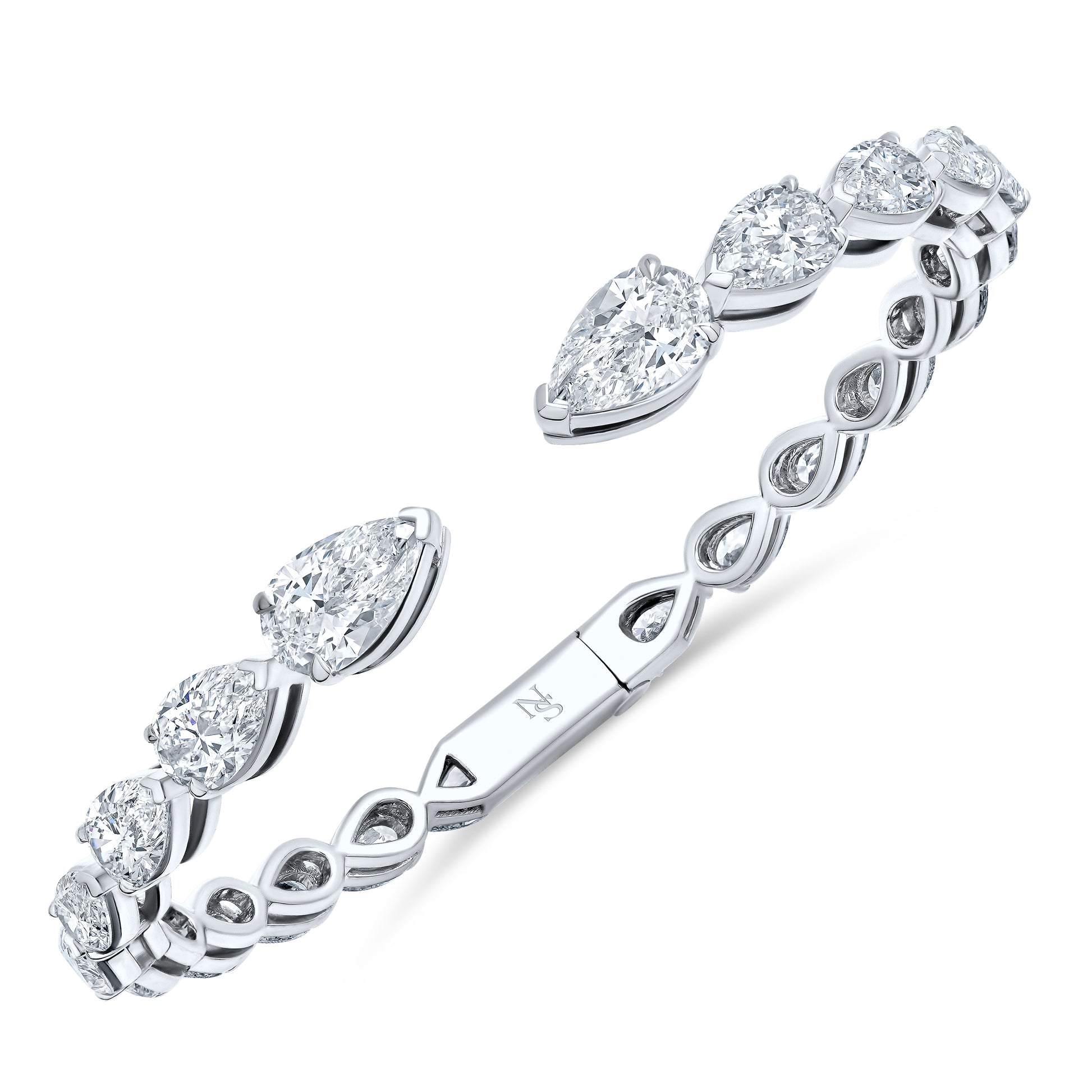 Make a bold statement with our Diamond Pear-Shaped Hinged Bangle, crafted in 18k white gold and adorned with 13.89 carats of brilliant diamonds. This sophisticated piece combines timeless elegance and modern design, adding a touch of luxury to any ensemble. Perfect for special occasions or daily glamour.