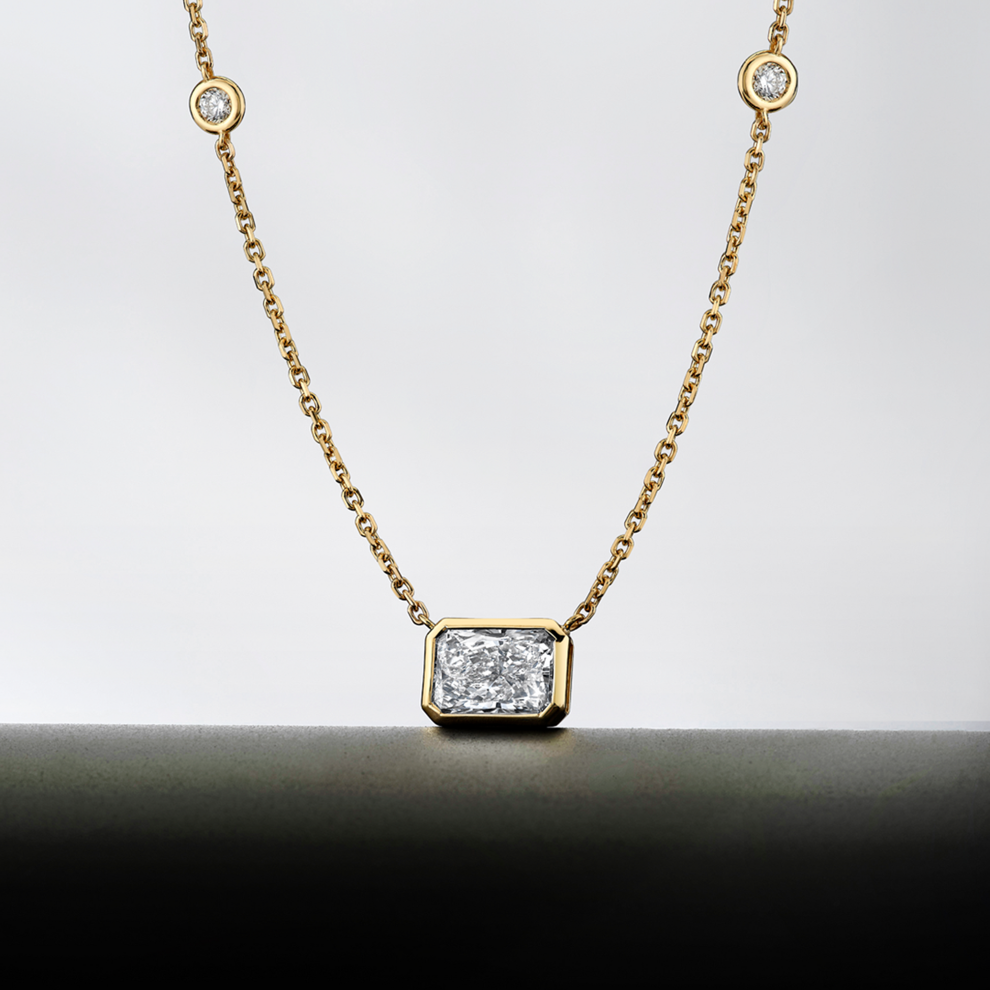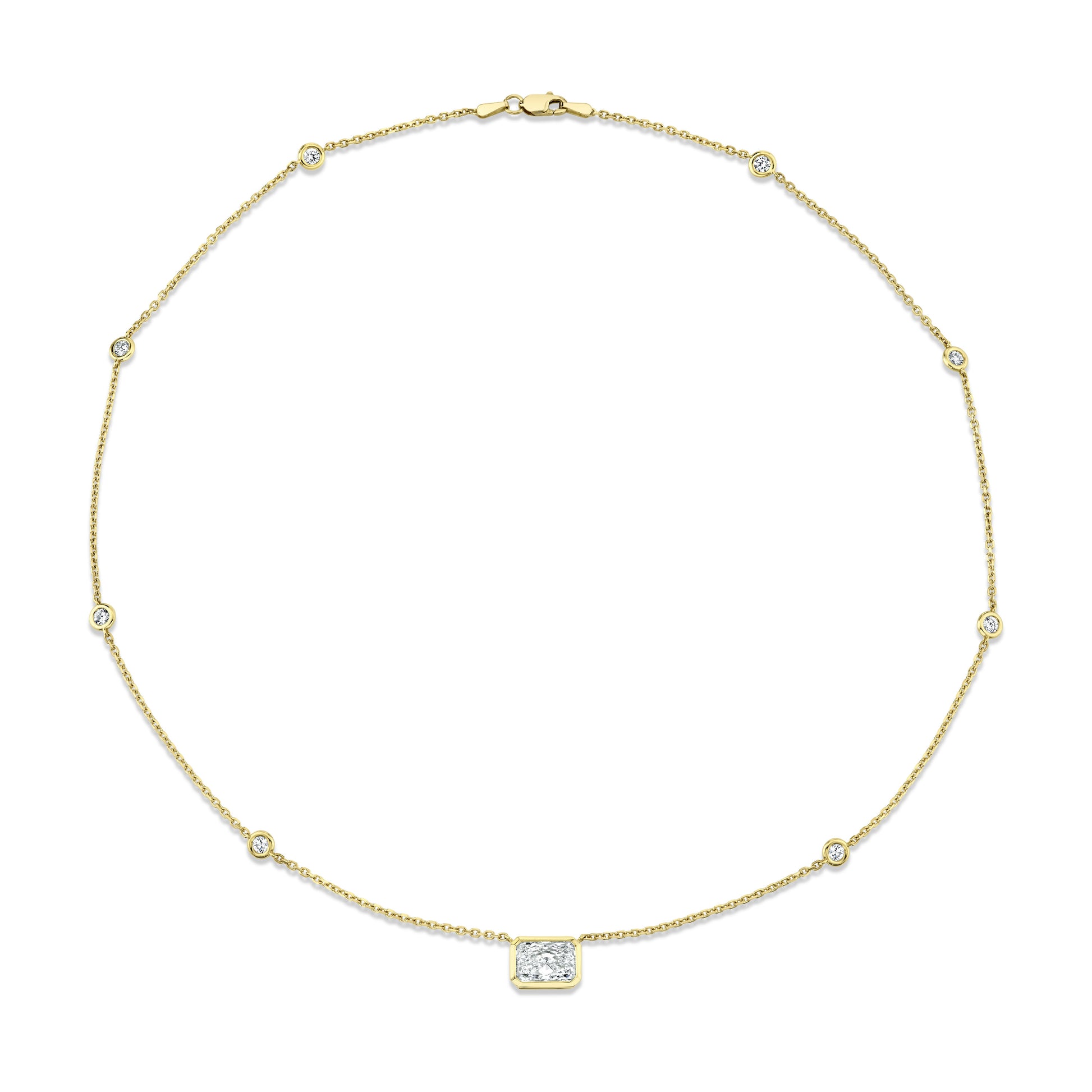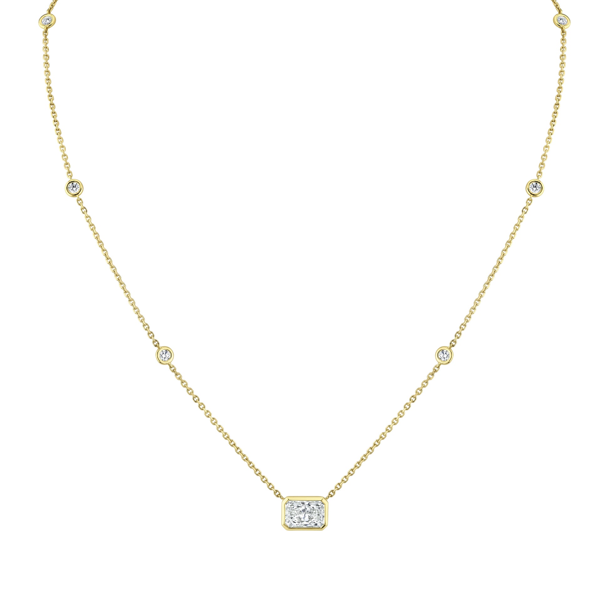 Discover the exquisite craftsmanship of our Diamond Station Pendant with a captivating Radiant Cut center stone, set in 14k yellow gold. This pendant is a testament to timeless beauty, featuring both radiant and round-cut diamonds, each certified for their exceptional quality. The warm allure of 14k yellow gold sets the perfect backdrop for these dazzling diamonds, making this pendant an essential piece of luxury.