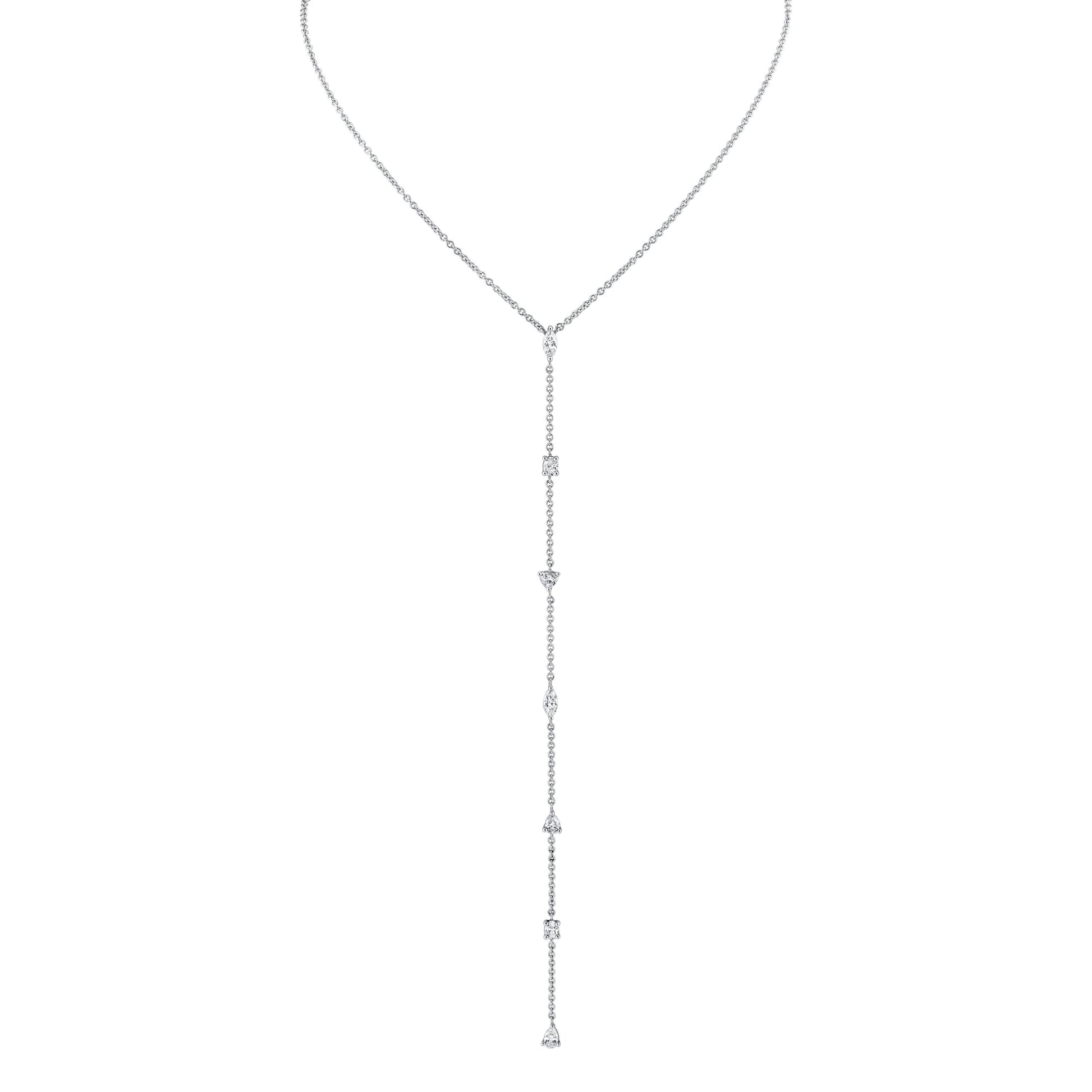 Experience opulent elegance with our Diamonds Lariat Necklace featuring Fancy Shapes. Meticulously crafted, this exquisite piece showcases a stunning array of fancy-shaped diamonds adorning the 18k white gold lariat chain. Designed to elevate any look with timeless sophistication
