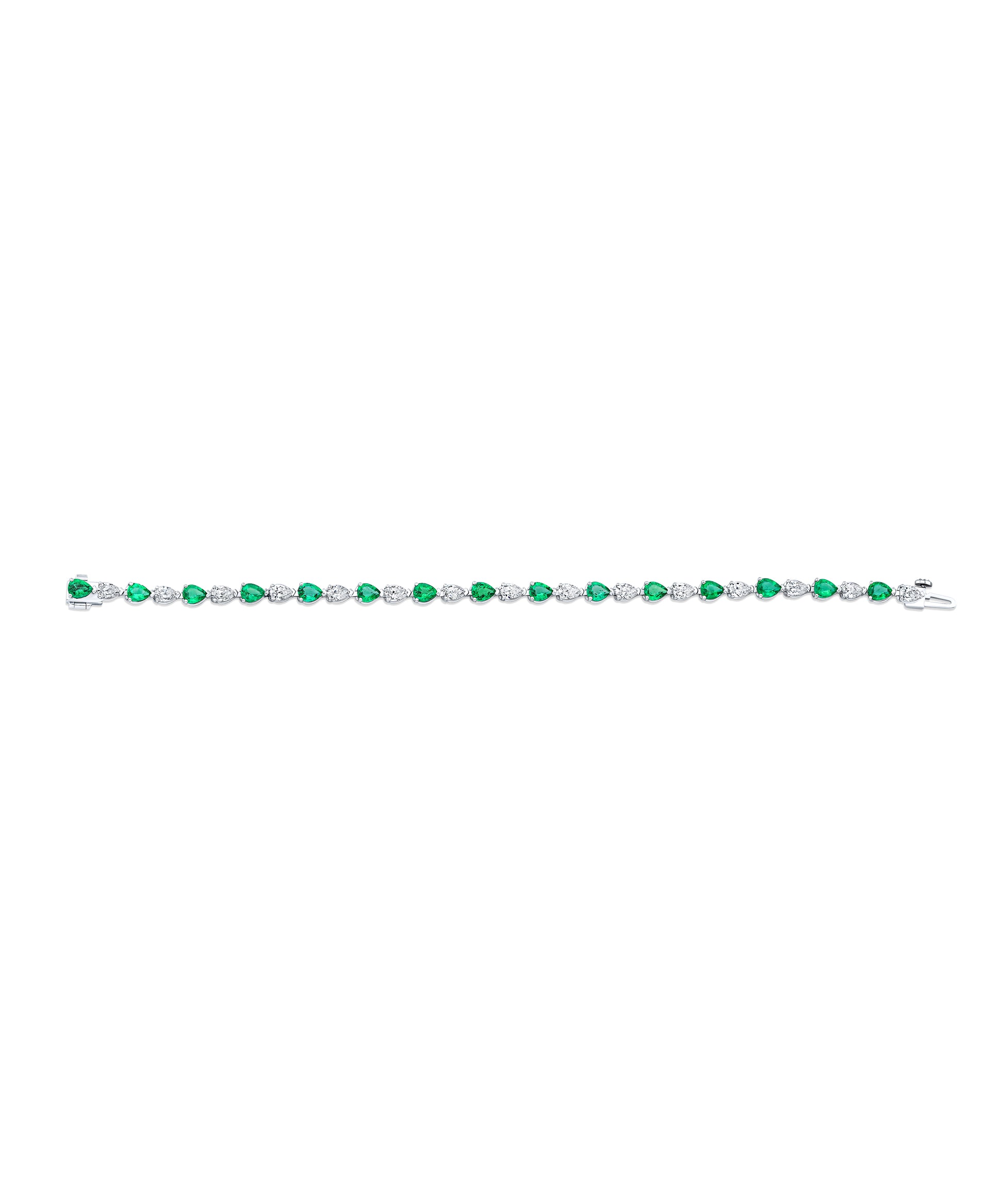 This bracelet features an East West pattern of alternating pear-shaped diamonds and emeralds totaling 6.69 carats, all set in 18k white gold. A fresh take on a classic pairing, blending vibrant color with refined brilliance.