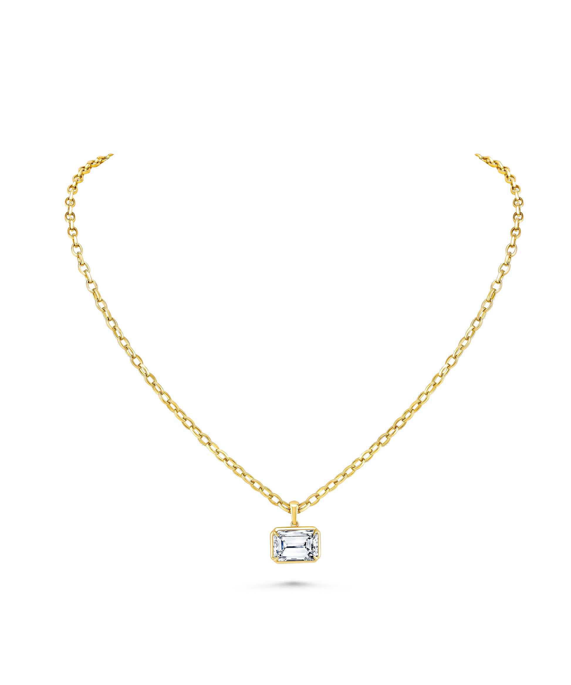 A 6.63 carat emerald-cut diamond is set East West in an 18k yellow gold bezel-prong design and suspended from a delicate chain. A modern silhouette that exudes sophistication.