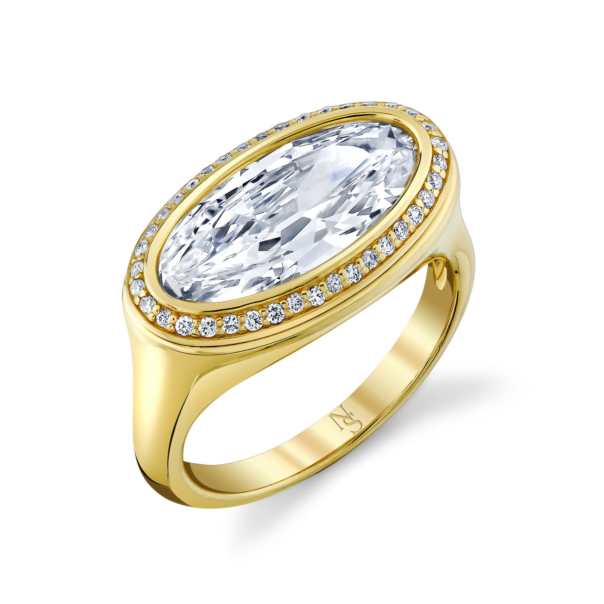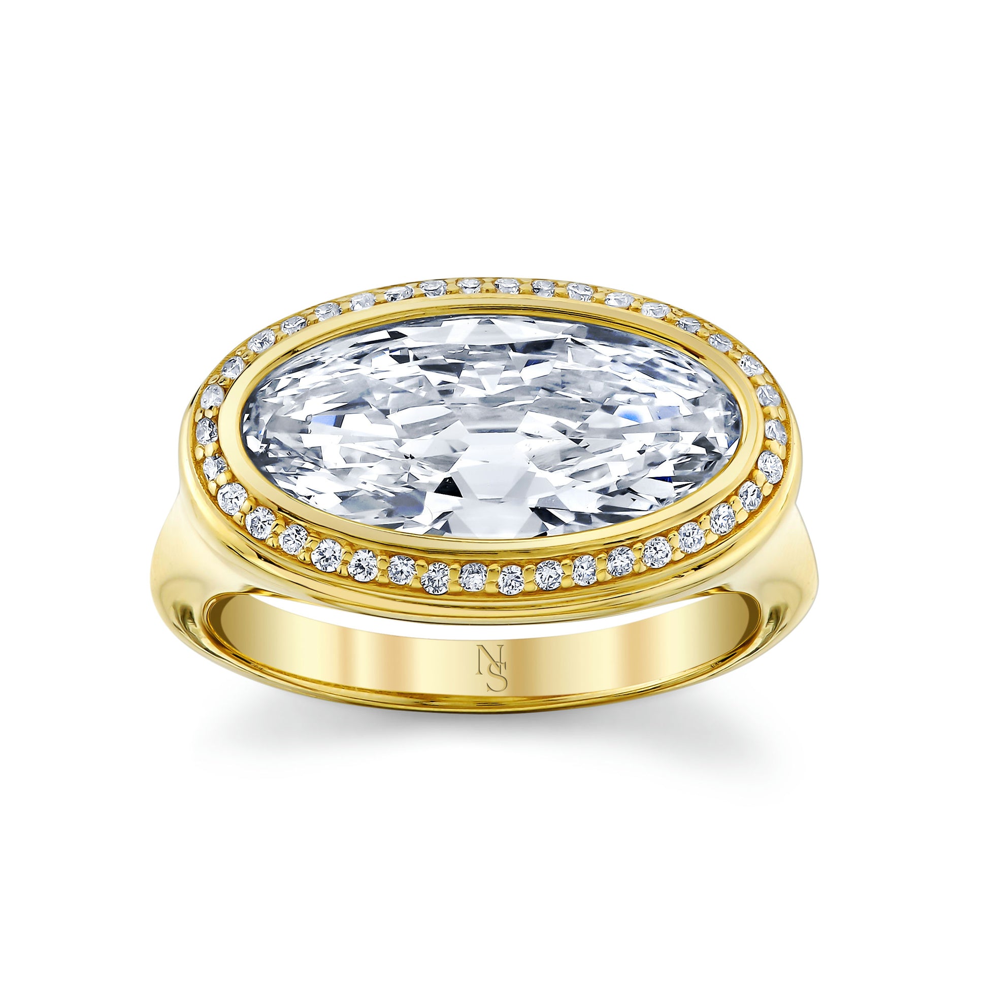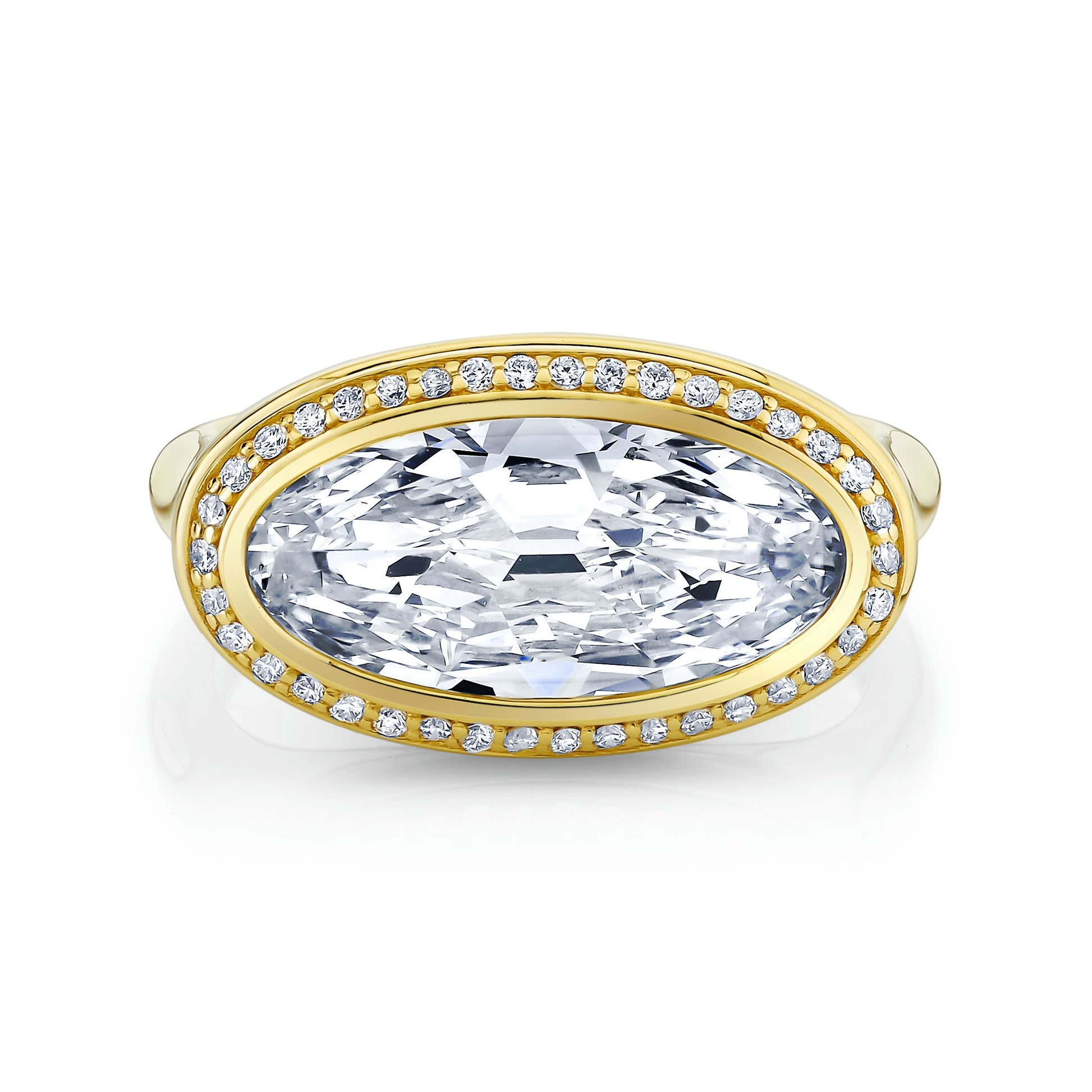 Discover timeless elegance with our East West Oval Cut Diamond Halo Ring, certified for its exquisite craftsmanship and quality. Featuring a stunning oval-cut diamond set horizontally, surrounded by a halo of smaller diamonds, this ring exudes sophistication and luxury.