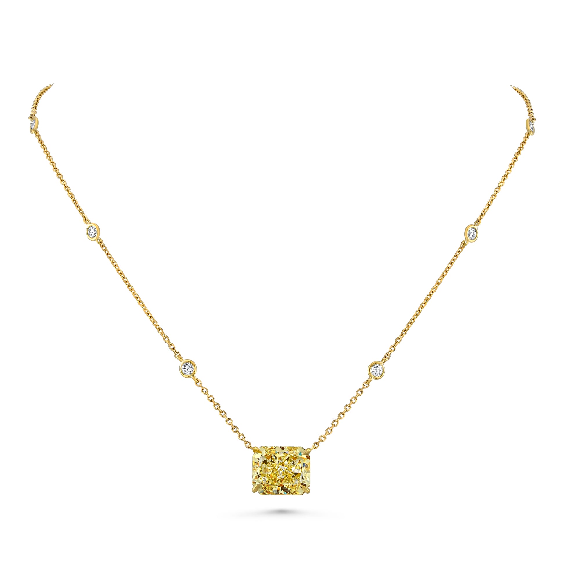 The East West Radiant Pendant on Diamond Station Chain showcases a breathtaking 7-carat radiant-cut center diamond, elegantly set sideways and accented by round diamond stations—a sleek, modern classic with timeless brilliance.