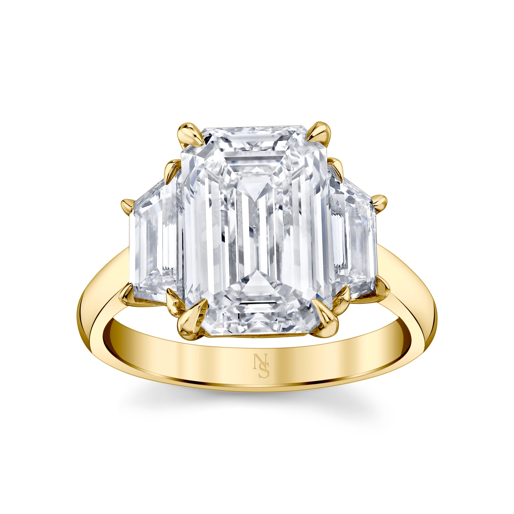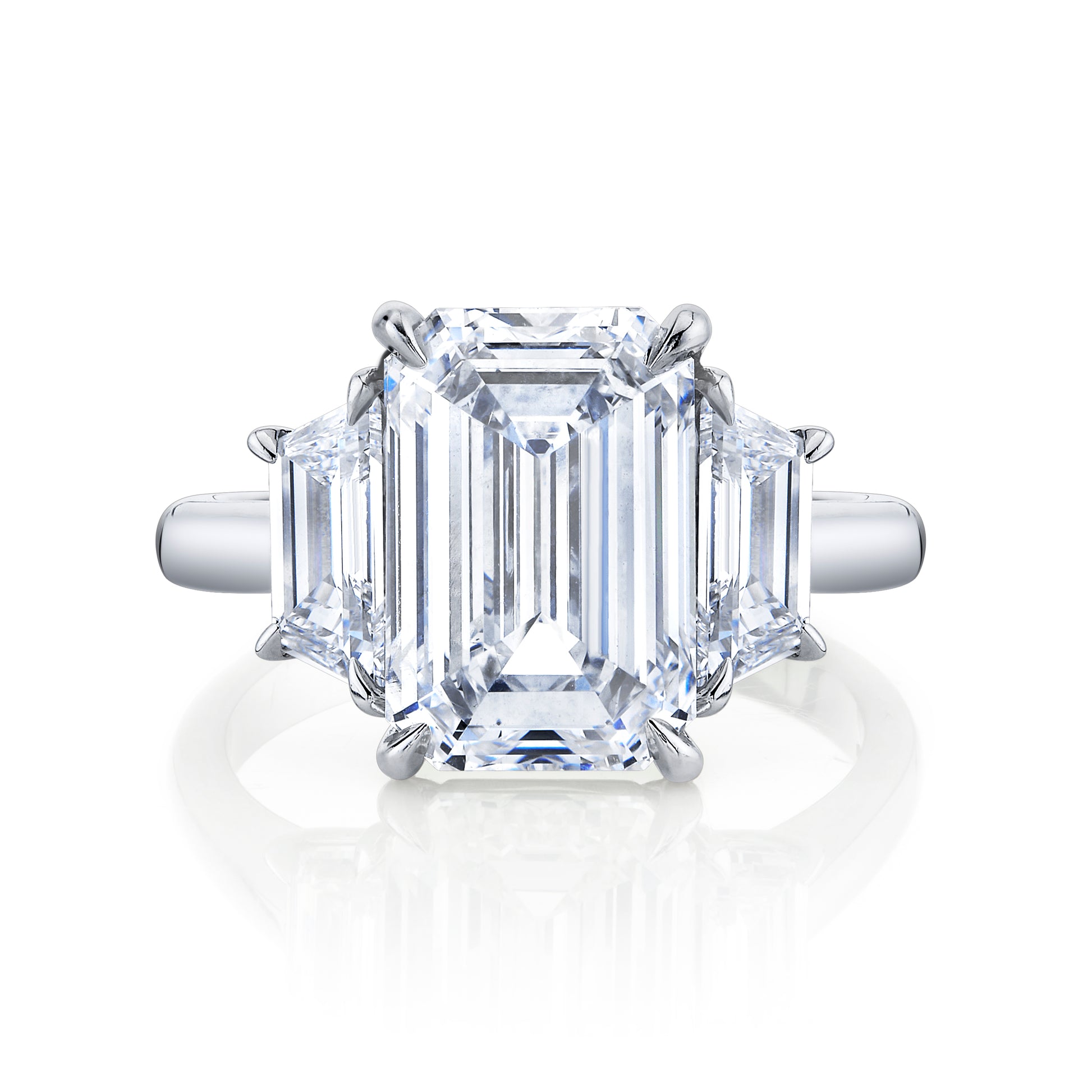 This three-stone ring features a 3.50 carat emerald-cut diamond, complemented by .81 carats of trapezoid-shaped side diamonds. The clean lines and balanced proportions create a refined, timeless silhouette. Available in various metal colors.