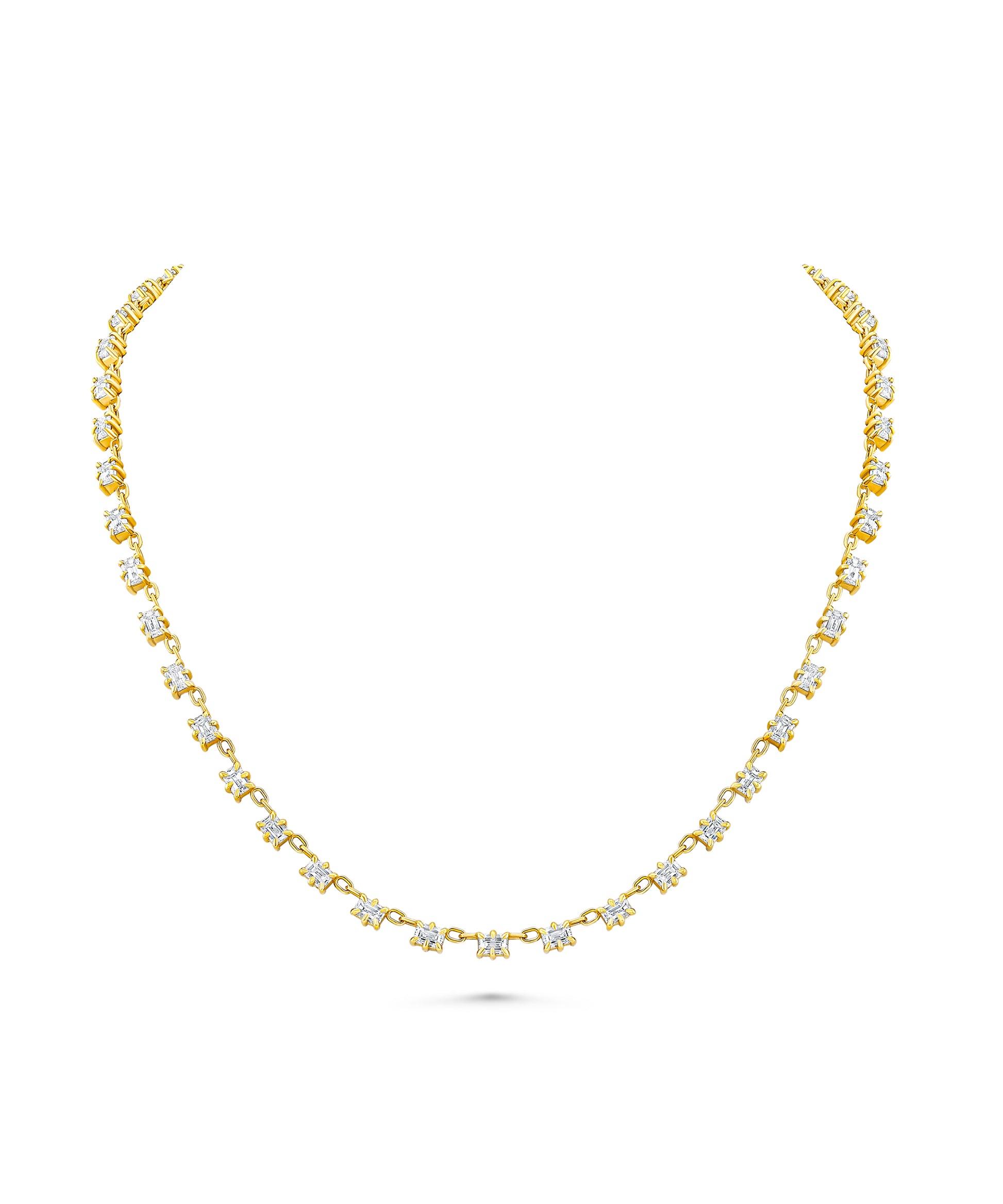 This necklace features emerald-cut diamonds totaling 10.90 carats, set along a 16-inch 18k yellow gold chain. A sleek, modern design that highlights the clean lines and quiet brilliance of each stone.