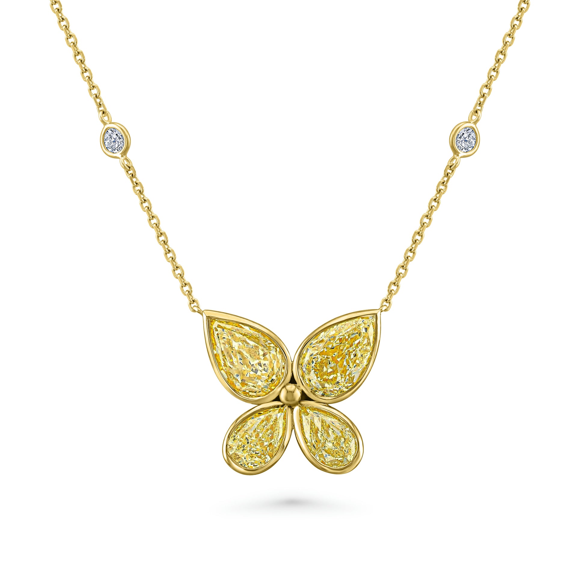 This exquisite Fancy Yellow Diamond Butterfly Necklace features 6.21 carats of pear-shaped yellow diamonds, elegantly bezel-set in radiant 18k yellow gold. Each certified diamond shines with remarkable brilliance, forming a stunning butterfly design that adds a touch of luxury and charm. A statement piece, perfect for elevating any jewelry collection with its unique and timeless beauty.