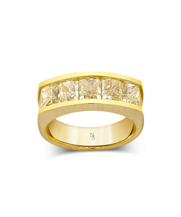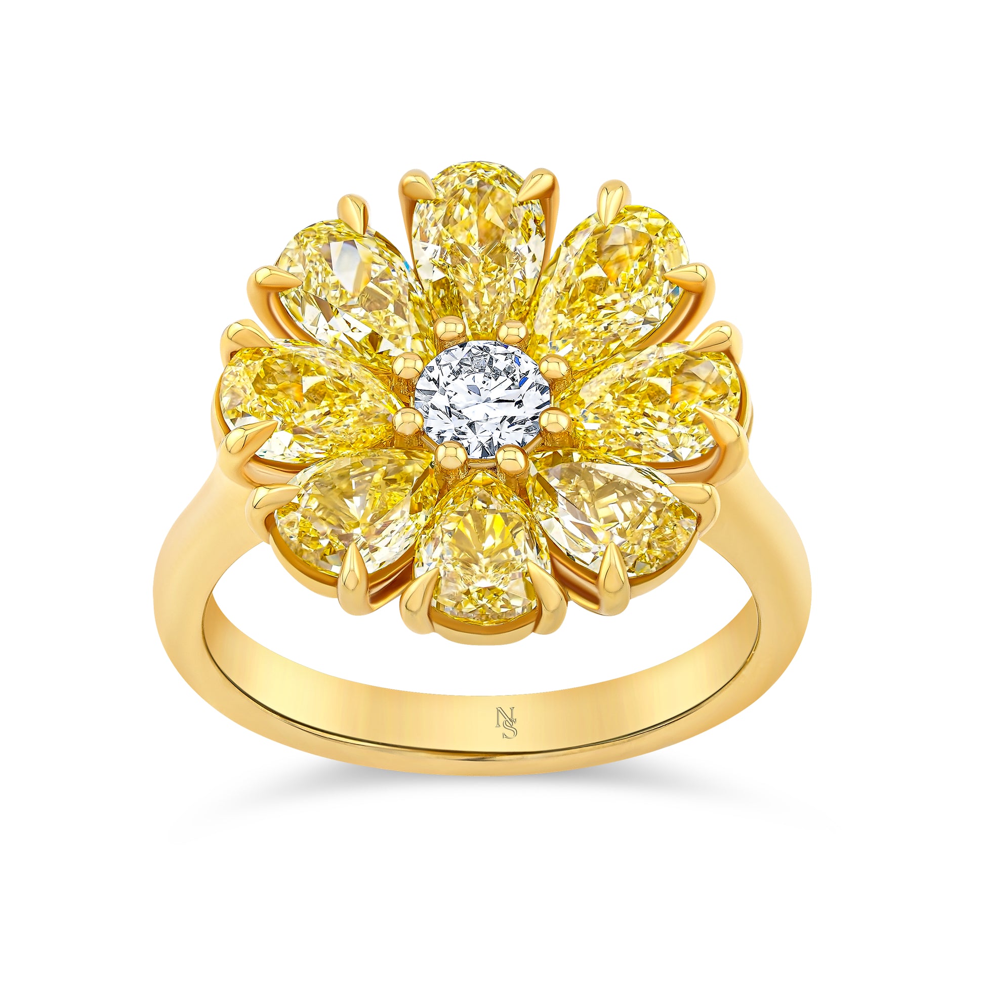 A floral-inspired ring with 3.15 carats of pear-shaped fancy yellow diamonds and a .25 carat white diamond center, set in 18k yellow gold—radiant, elegant, and timeless.