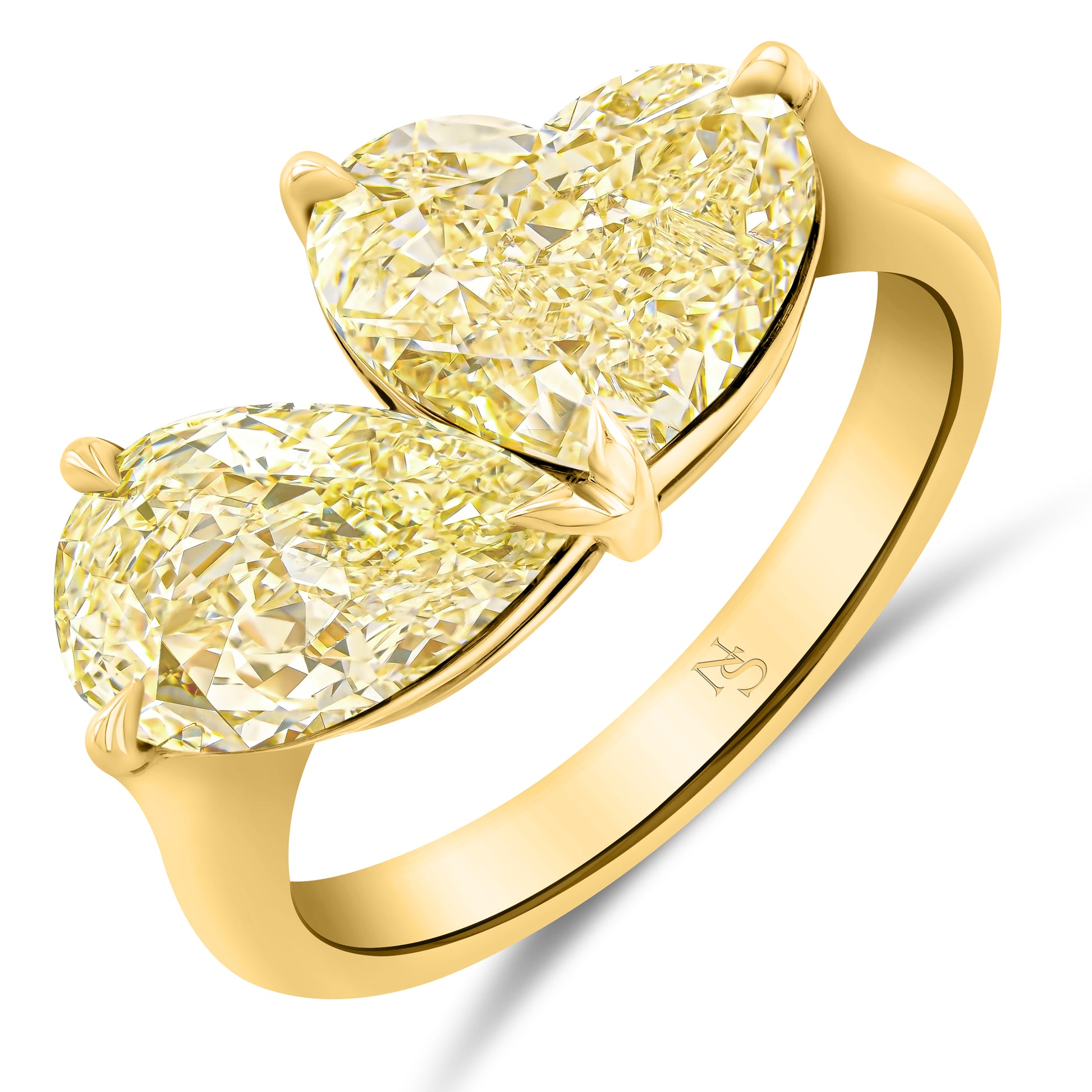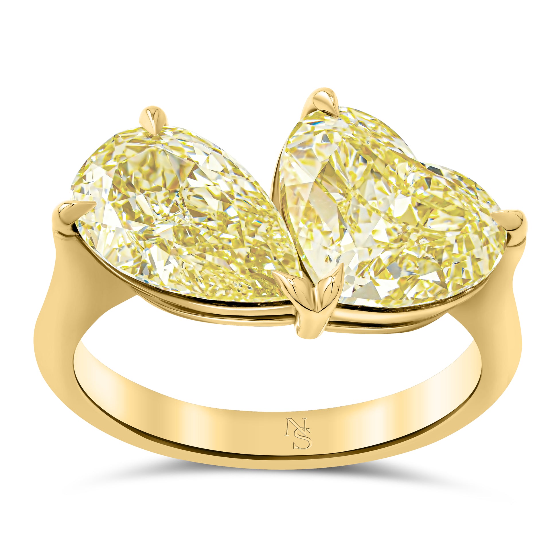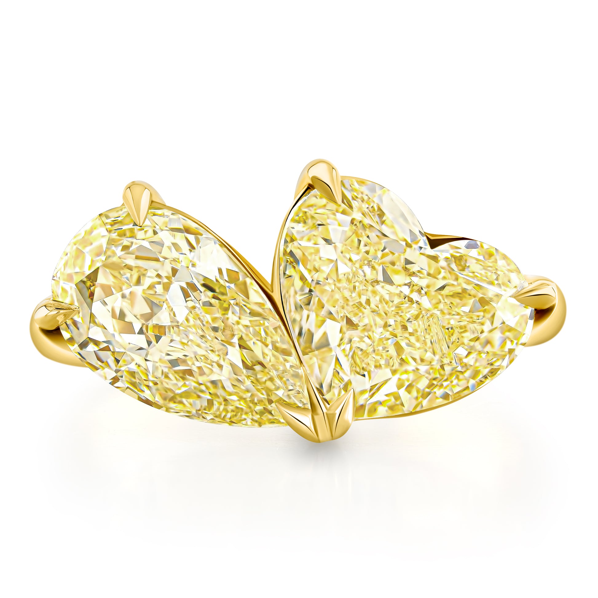 This exquisite Fancy Yellow Diamond Twin Ring features a 2.01-carat heart-shaped diamond and a 3.03-carat pear-shaped diamond, set in 18k yellow gold. The captivating combination of shapes and vibrant yellow diamonds creates a truly unique and luxurious piece, perfect for any fine jewelry collection.