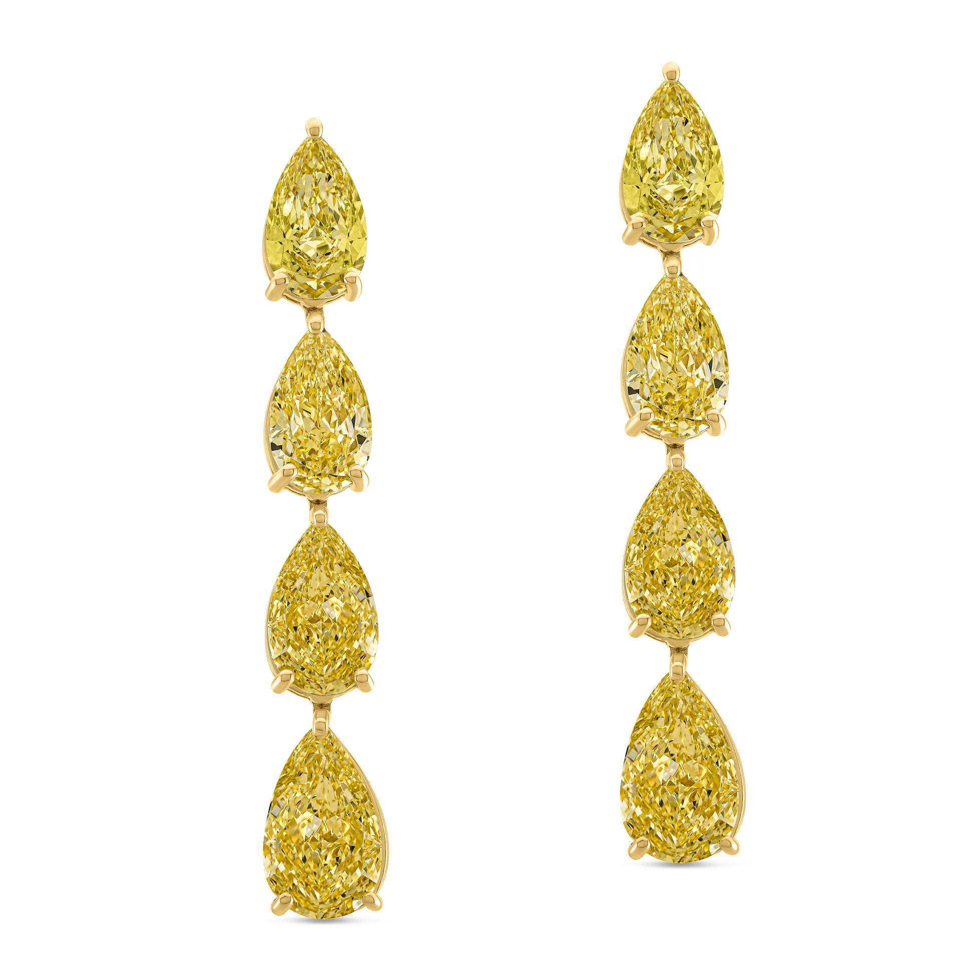 Radiant and refined, these Fancy Yellow Pear Diamond Graduating Drop Earrings feature 8 pear-shaped diamonds totaling 12.69 carats. Set in warm 18k yellow gold, they cascade with golden brilliance and timeless glamour.