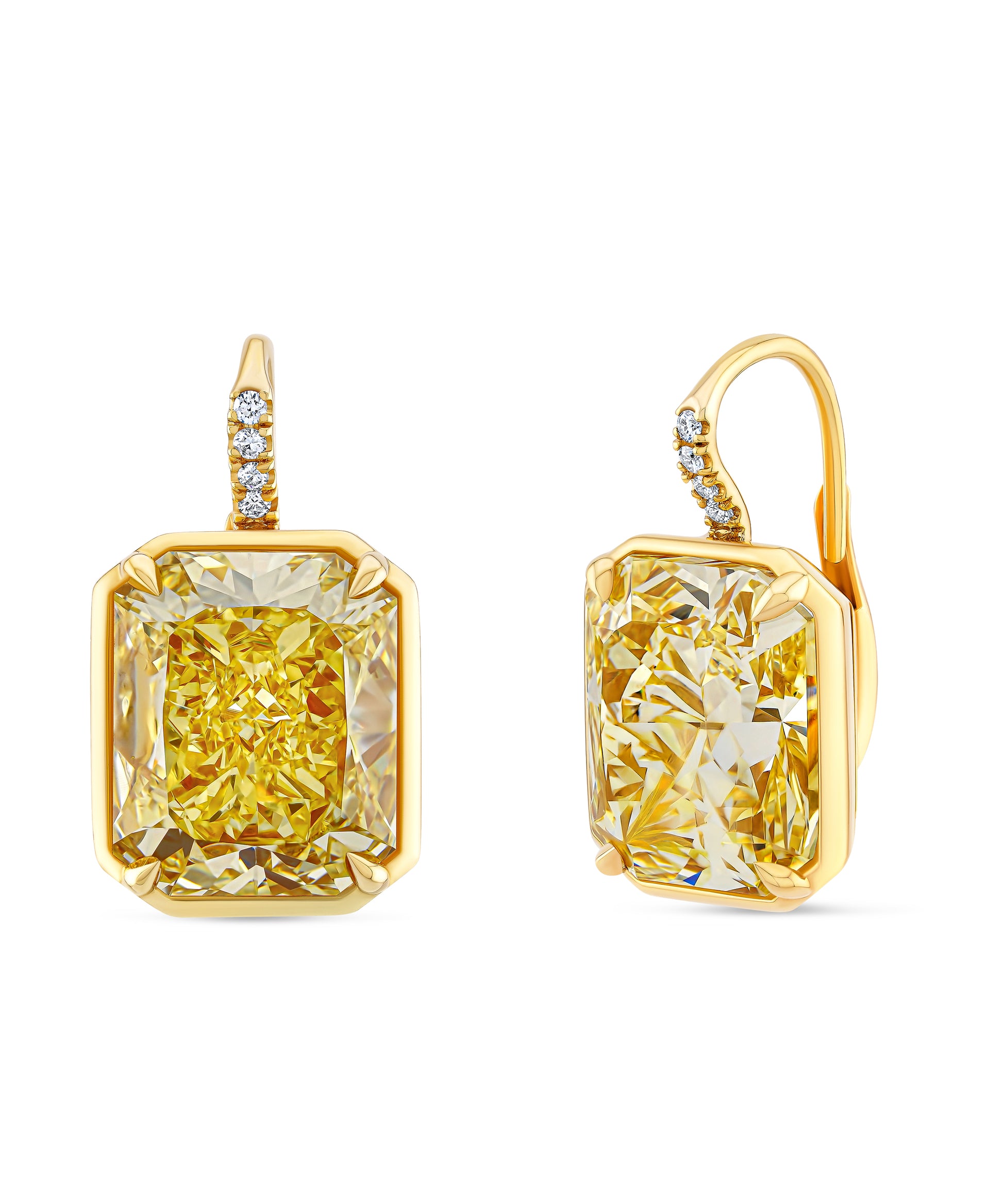 Graceful and luminous, these drop earrings feature over 14 carats of fancy yellow radiant-cut diamonds. Set in rich 18k gold, they bring bold color and timeless elegance to any occasion.