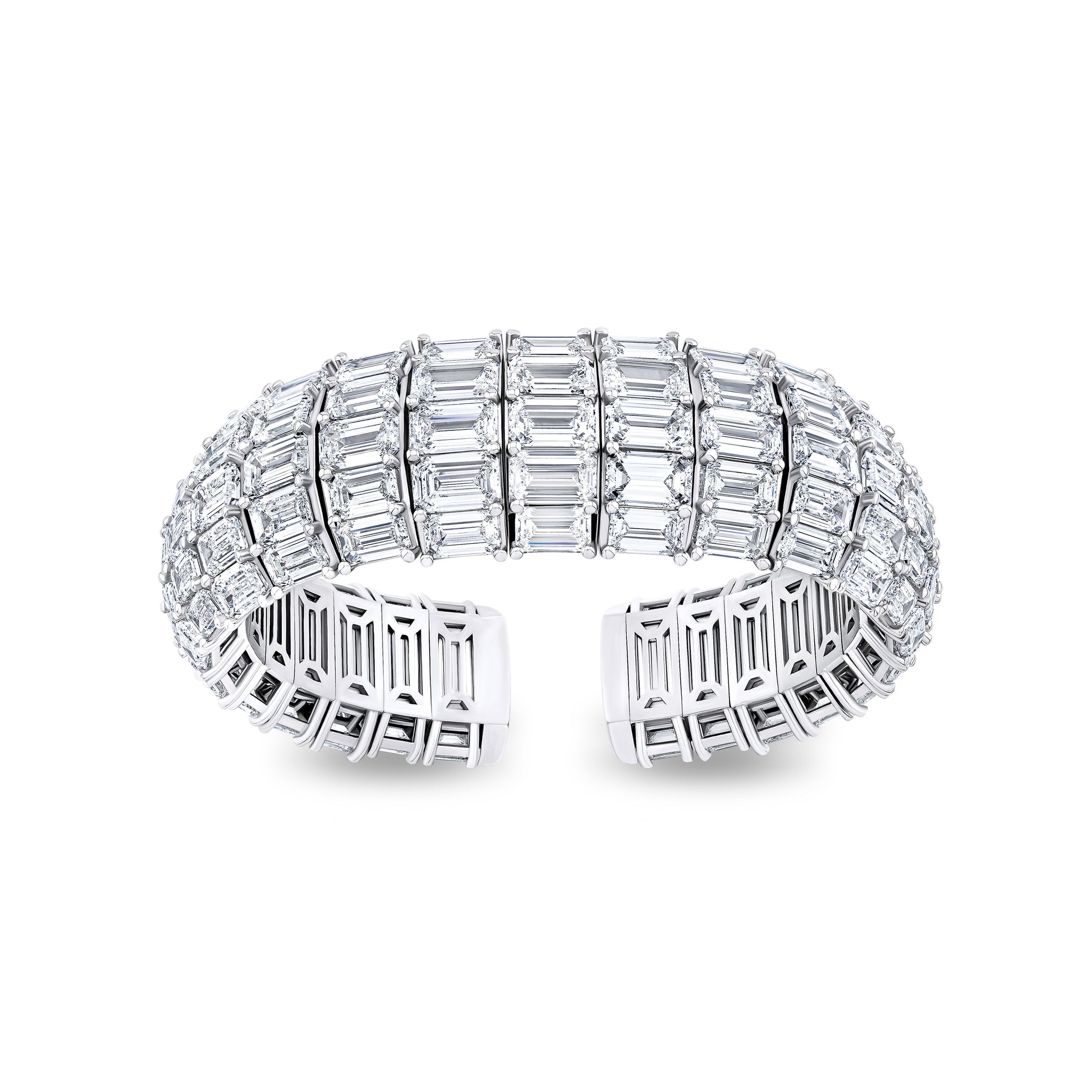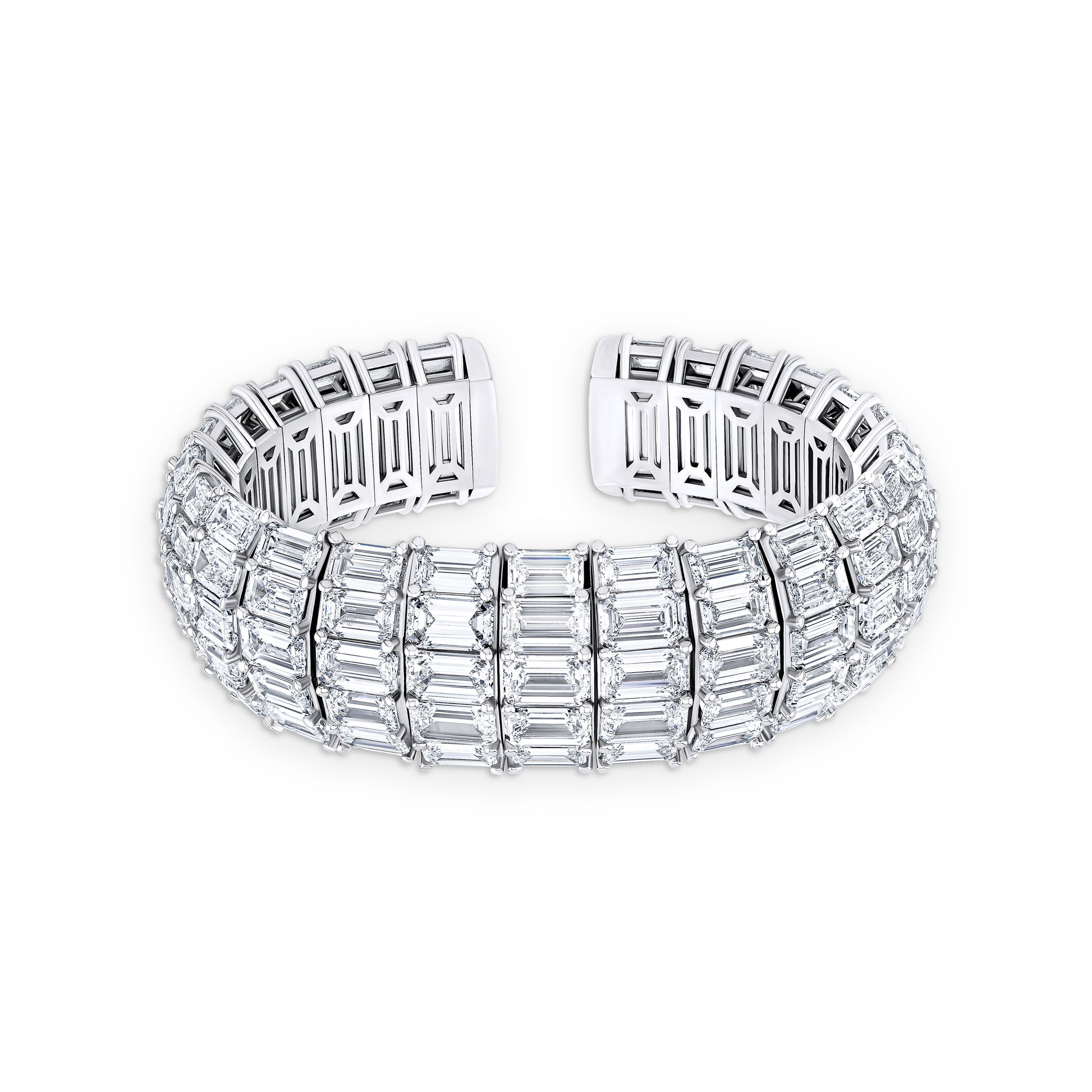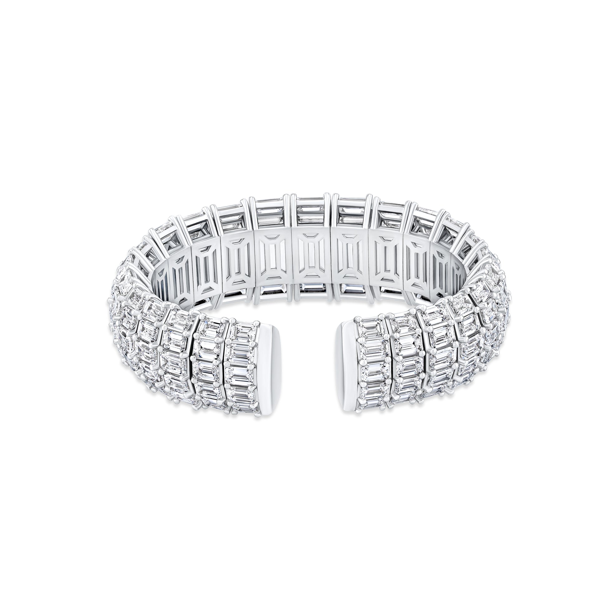 A masterpiece of modern craftsmanship, this five-row cuff features 125 emerald-cut diamonds totaling 66.57 carats. Set in 18k white gold, each diamond is meticulously aligned to create a bold, continuous stream of light.