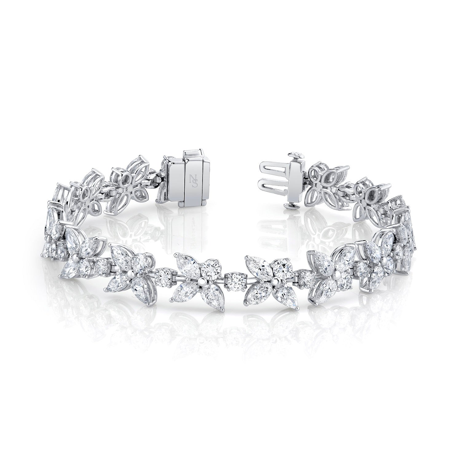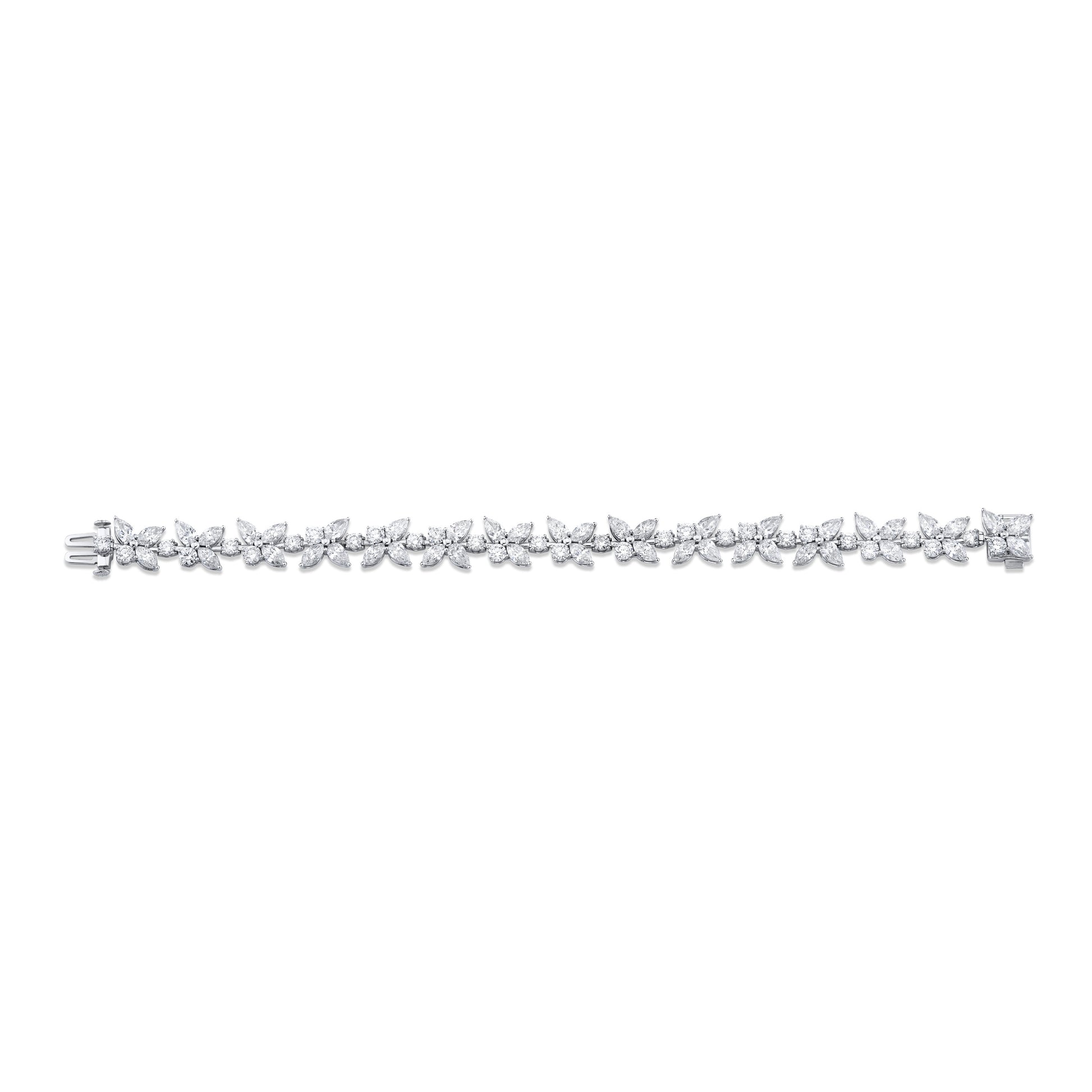 Introducing our stunning Floral Diamond Bracelet, exquisitely designed in lustrous 18k white gold. This piece features round, pear, and marquise shapes that effortlessly come together in a beautiful floral arrangement.