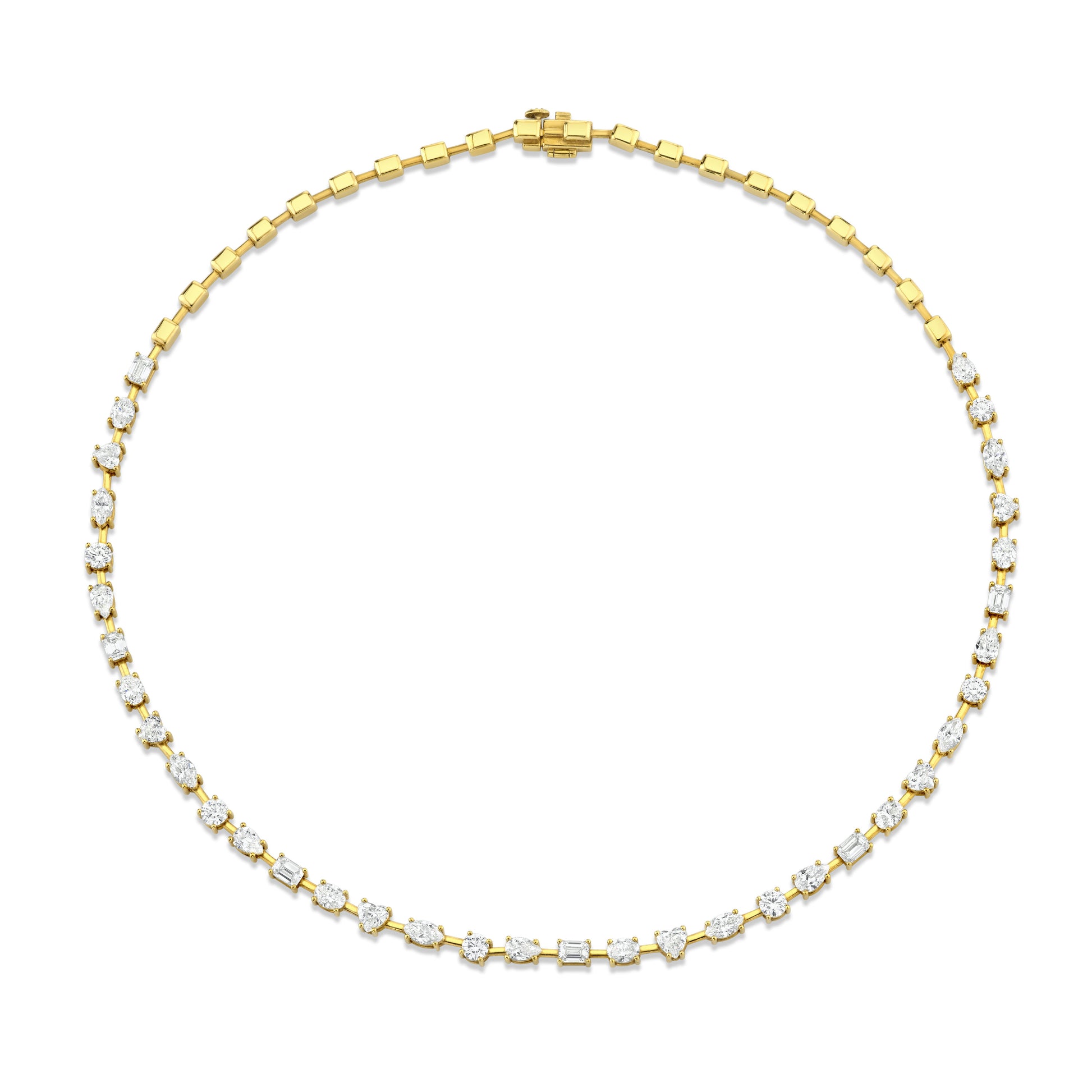 Discover unparalleled elegance with our Half Way Fancy Shape Diamonds Necklace. Crafted with precision, this exquisite piece features a captivating array of fancy-shaped diamonds set in a sleek bar setting.
