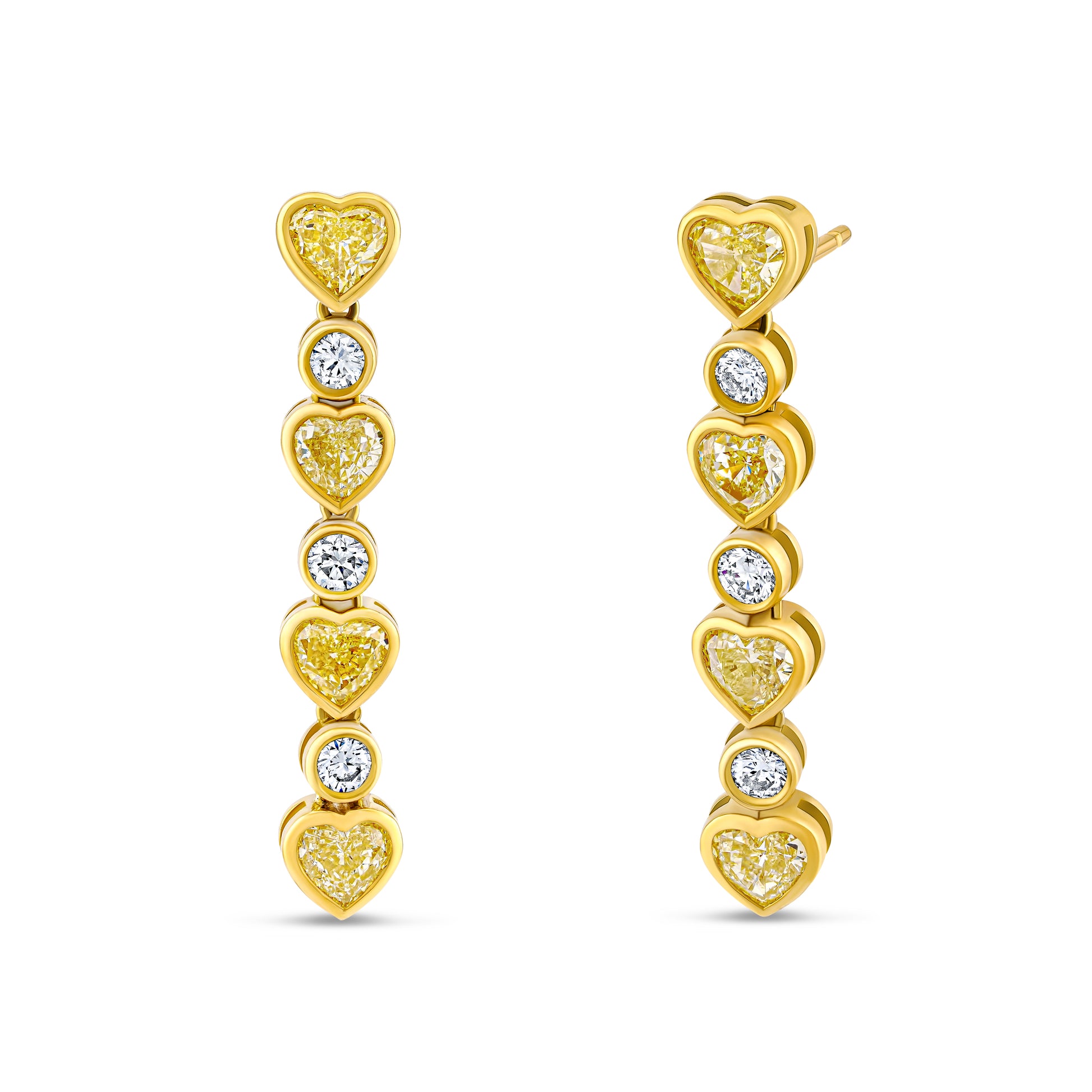 These heart dangle earrings showcase 3.54 carats of radiant yellow heart-shaped diamonds, complemented by .57 carats of round white diamonds set in 18k yellow gold elegant bezels. A refined choice for those seeking distinctive yellow diamond jewelry with exceptional sparkle and timeless appeal.