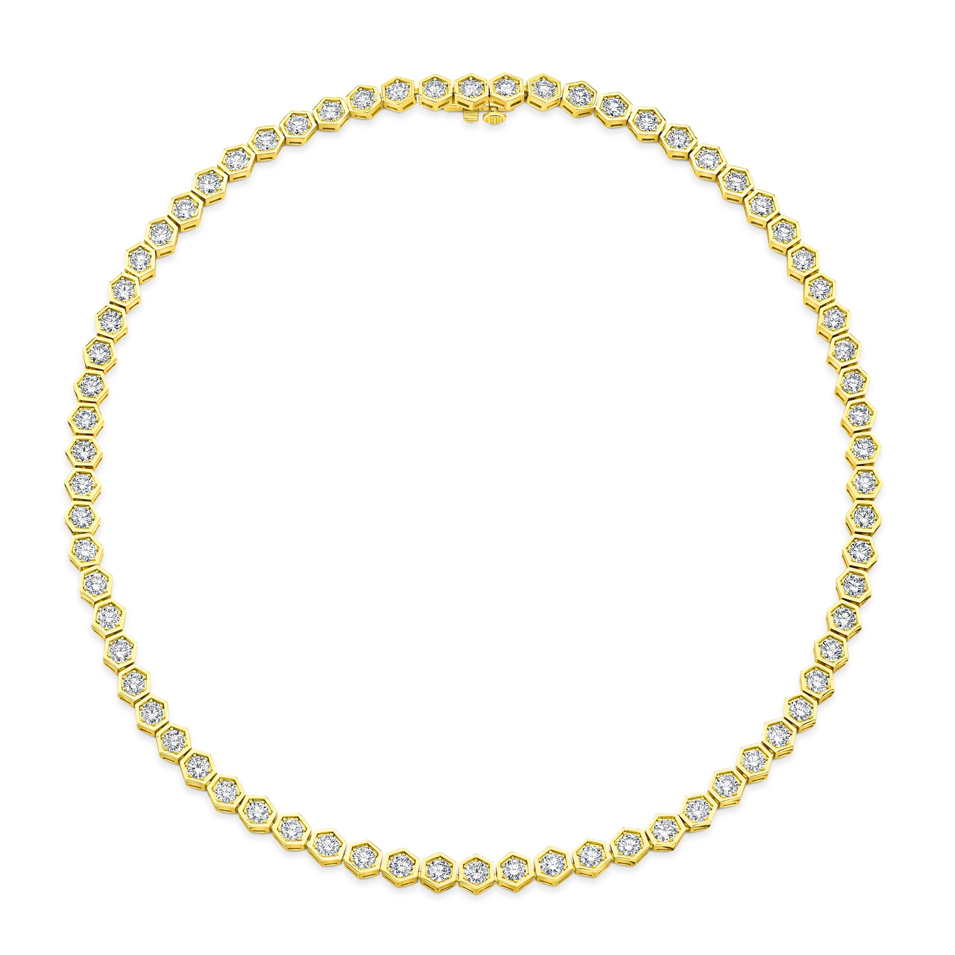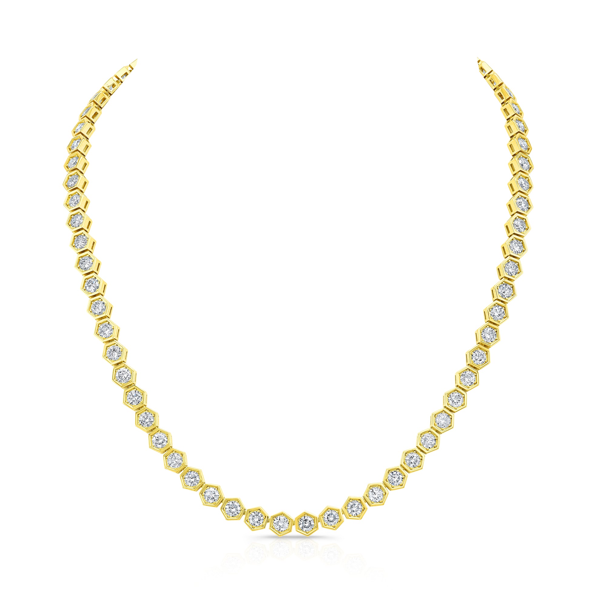 Discover unparalleled elegance with our Hexagon Bezel Set Necklace, featuring 12.24ct of round diamonds set in exquisite 18k yellow gold. A perfect fusion of modern design and timeless luxury, this necklace adds a touch of brilliance to any occasion. Elevate your collection with this masterpiece.