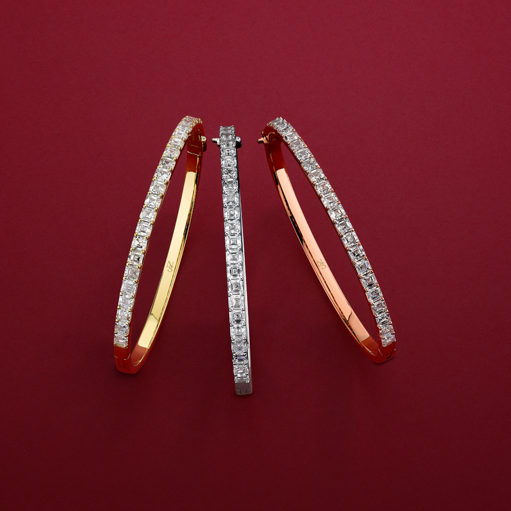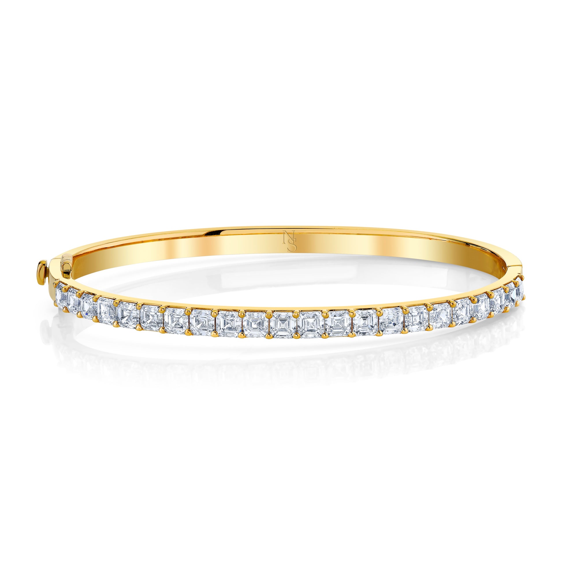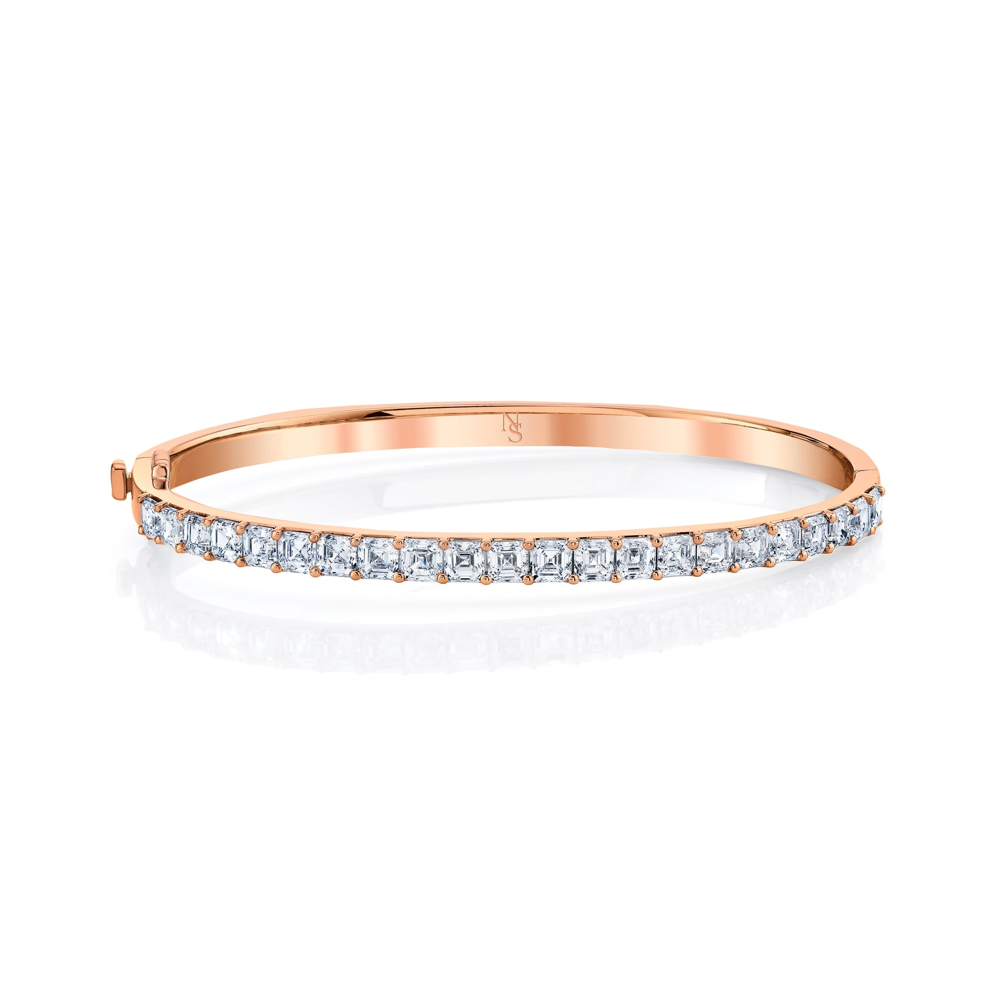 This hinged bangle with Asscher cut diamonds showcases the natural beauty of the stones. Its hinge-style design allows for versatile wear, making it perfect for everyday wear. The bangle is polished to perfection showcasing each facet of the Asscher cut diamond.