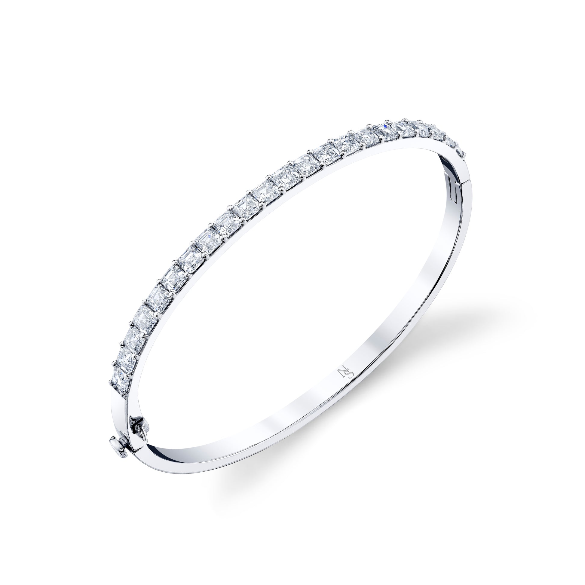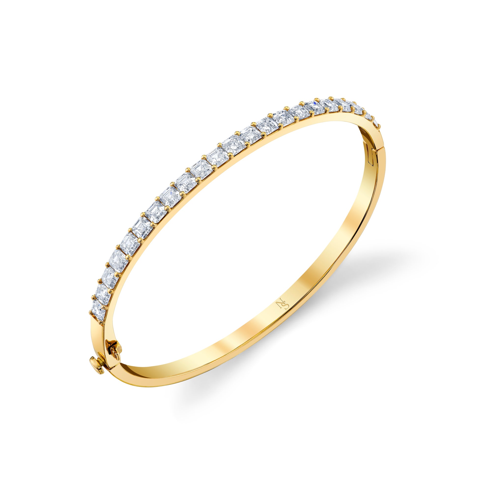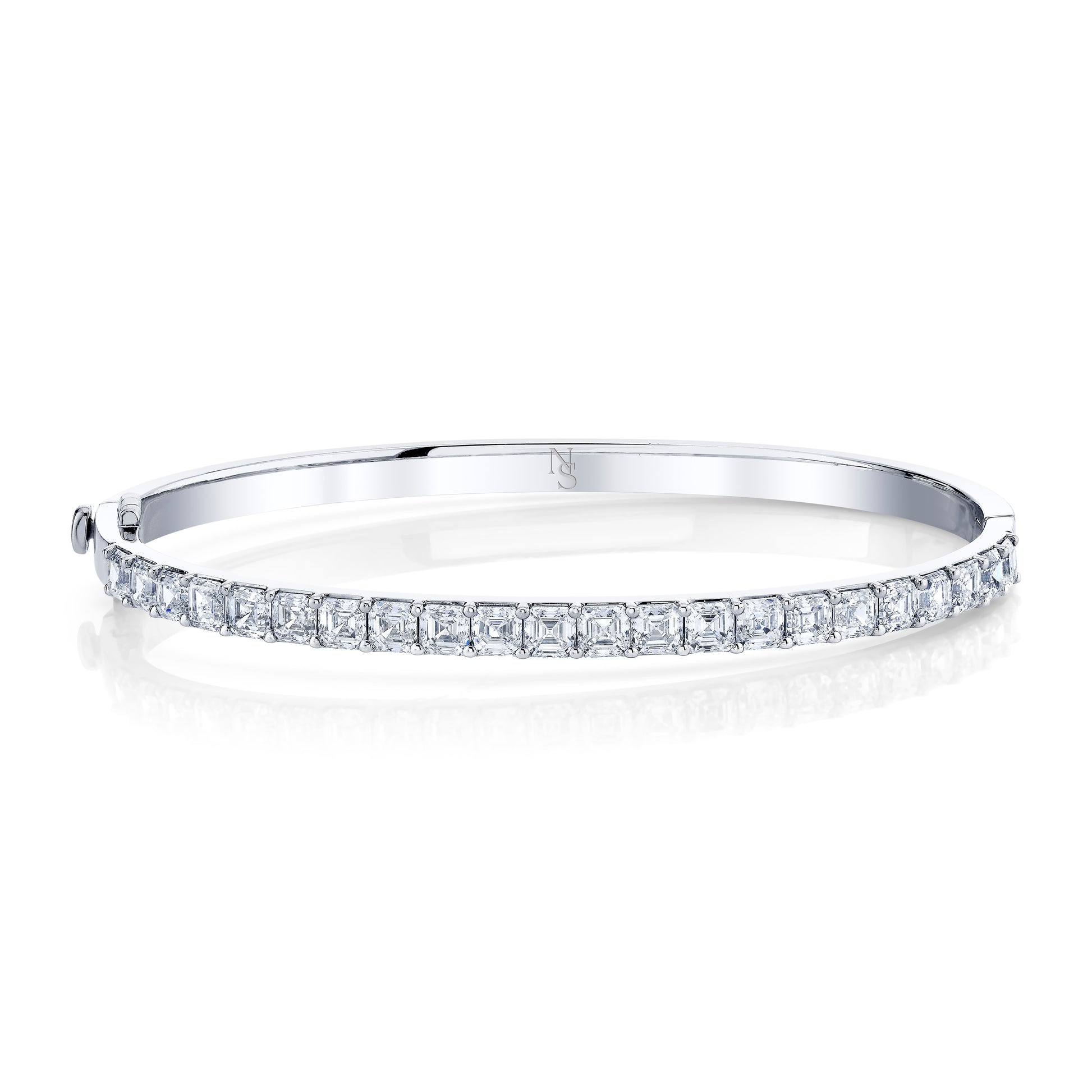 This hinged bangle with Asscher cut diamonds showcases the natural beauty of the stones. Its hinge-style design allows for versatile wear, making it perfect for everyday wear. The bangle is polished to perfection showcasing each facet of the Asscher cut diamond.