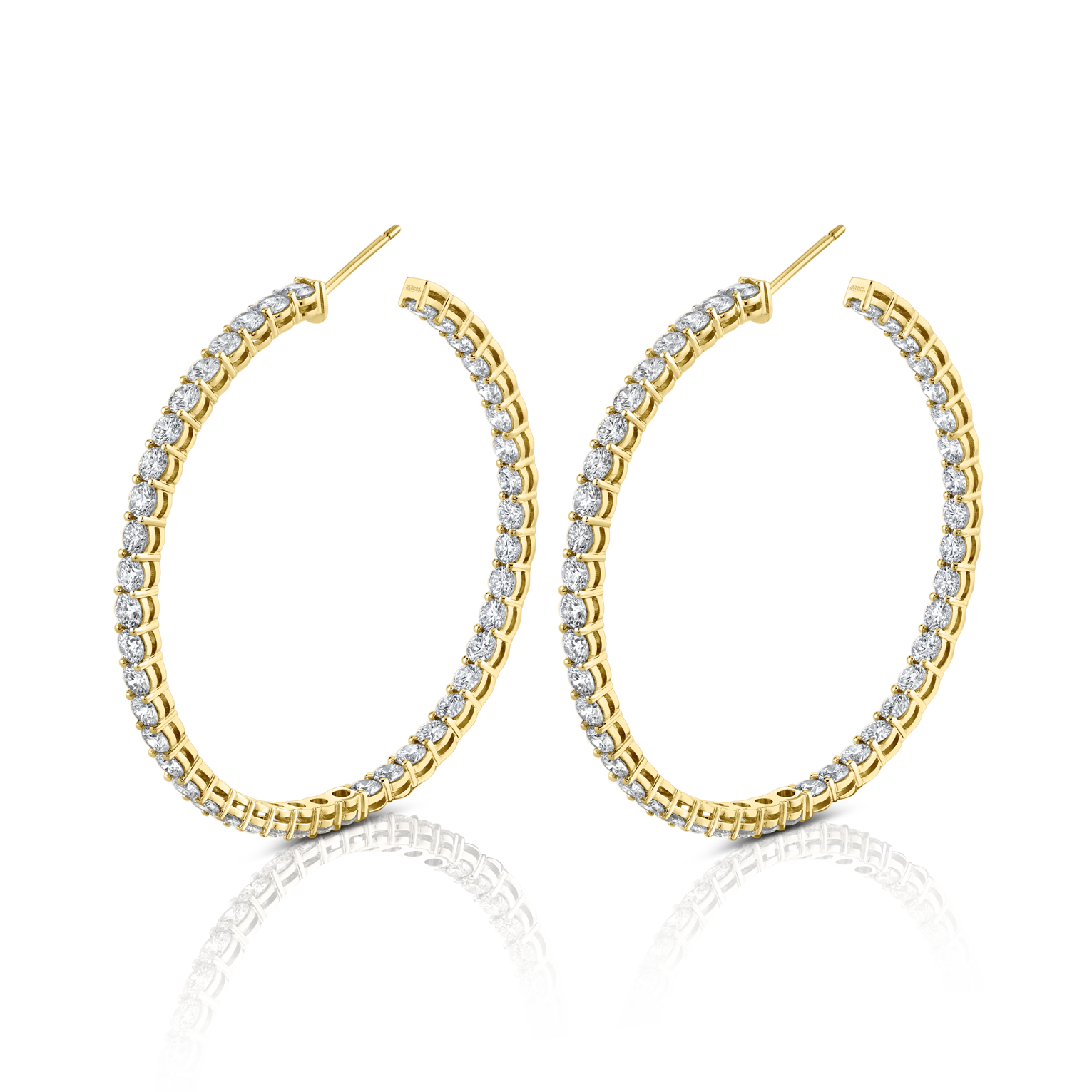 Elevate your collection with our Signature Round Diamond Hoops in Yellow Gold. These hoops feature brilliant round diamonds set inside-out with a total carat weight of between 5.00-10.00. Perfect for adding a touch of luxury, they offer timeless beauty and a sophisticated shine for any occasion.