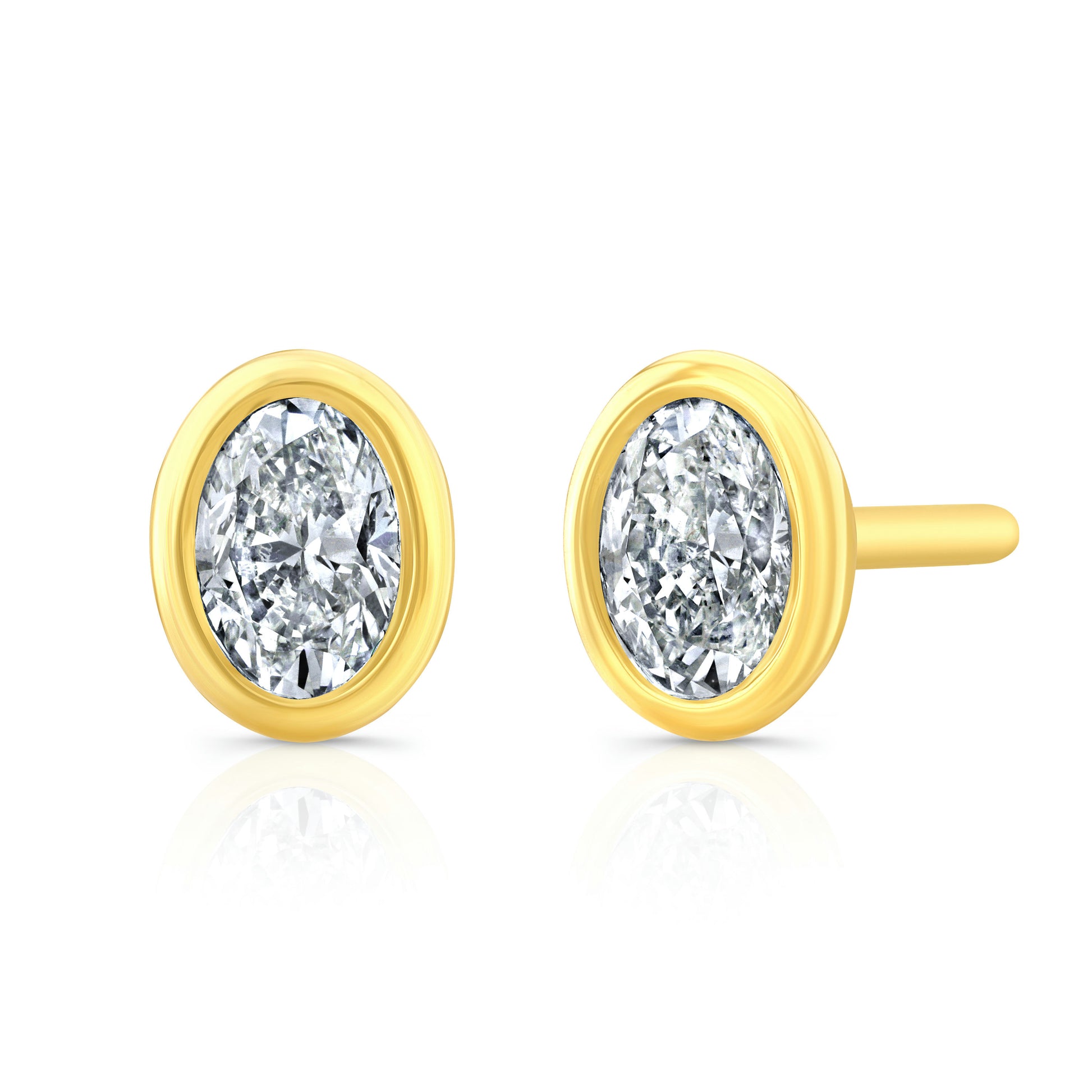 Experience timeless elegance with our Oval Shape Diamond Bezel Studs, crafted from luxurious 18k yellow gold. These exquisite earrings feature dazzling oval-cut diamonds with a 0.380 total carat weight. These studs are delicately encased in sleek bezel settings. Perfect for both everyday wear and special occasions.