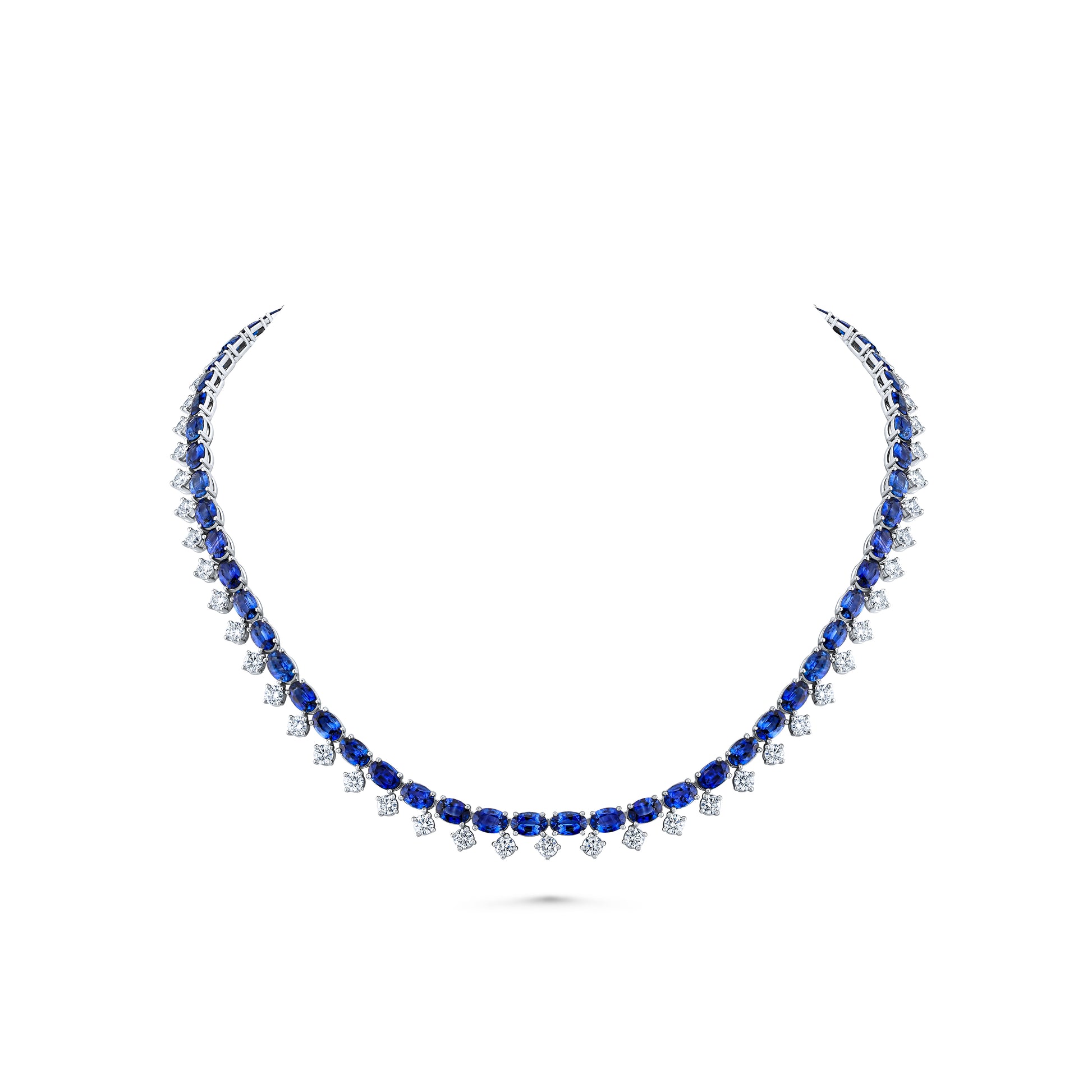 This necklace features 31.47 carats of oval blue sapphires paired with 8.74 carats of diamonds, creating a striking balance of rich color and brilliant sparkle. A refined, elegant design that makes a statement from every angle.