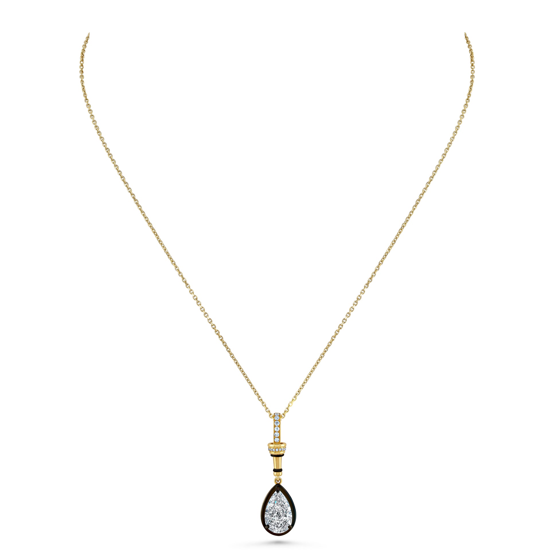 A striking 5.11 carat pear-shaped diamond pendant is the focal point of this elegant necklace, accented with 0.15 carats of diamonds, black enamel, and set in 18k yellow gold. The pendant hangs from a classic yellow gold link chain.
