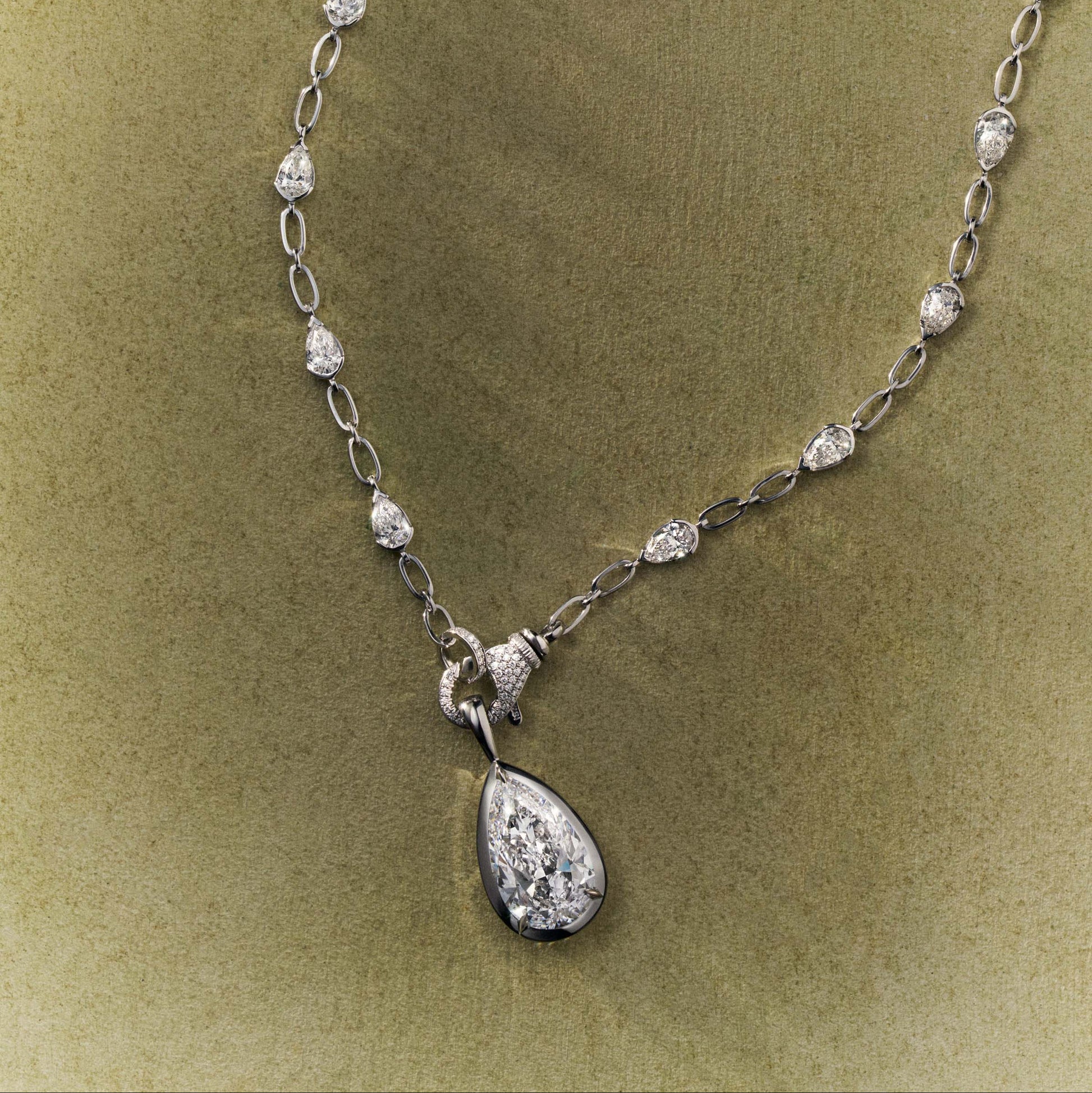 This pear solitaire pendant features a 10.04 carat pear-shaped diamond set in an 18k white gold bezel-prong mounting. The design highlights the stone’s graceful silhouette and exceptional brilliance in a clean, modern setting.