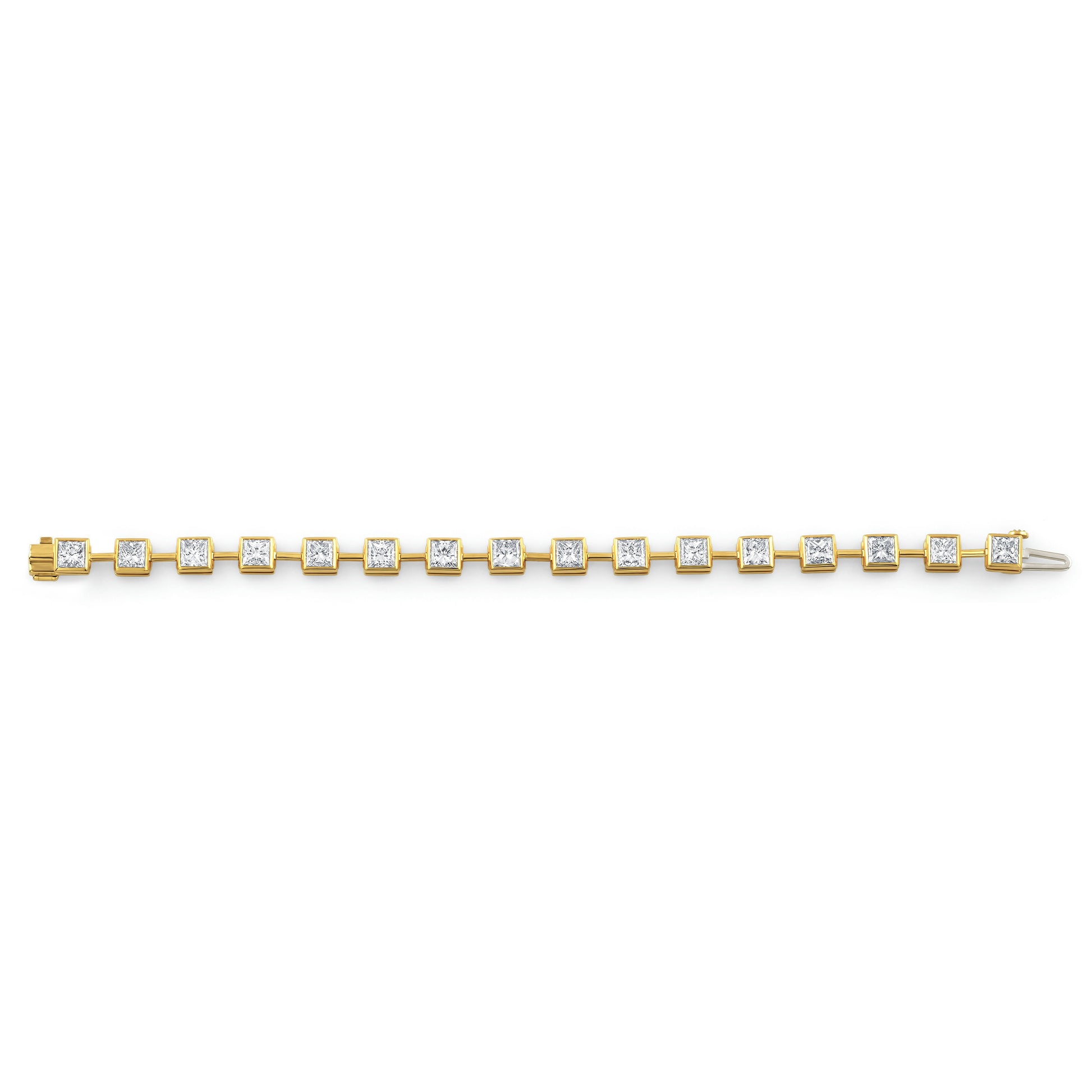 This exquisite Princess Cut Diamond Bezel-Set Bracelet features 11.81 carats of dazzling diamonds set in 18k yellow gold. Each certified diamond ranges in color from D to F, offering a brilliant yet refined sparkle. The bezel setting ensures each princess-cut diamond is securely nestled, highlighting its clean lines and elegance. A timeless addition to any jewelry collection.