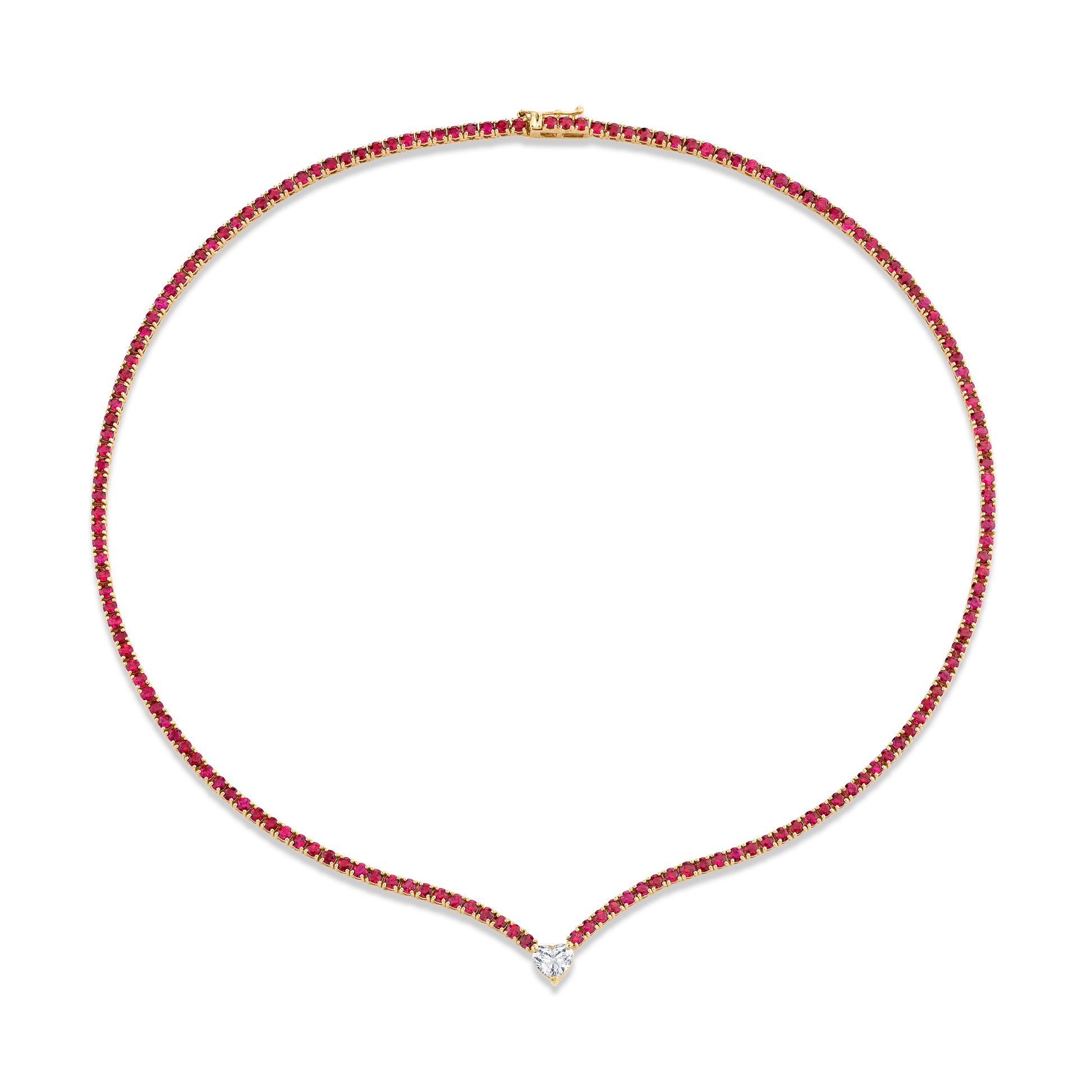 This straight line ruby necklace features 9.68 carats of vivid rubies, finished with a 0.71 carat diamond heart accent. A refined design that blends bold color with a subtle touch of romance.