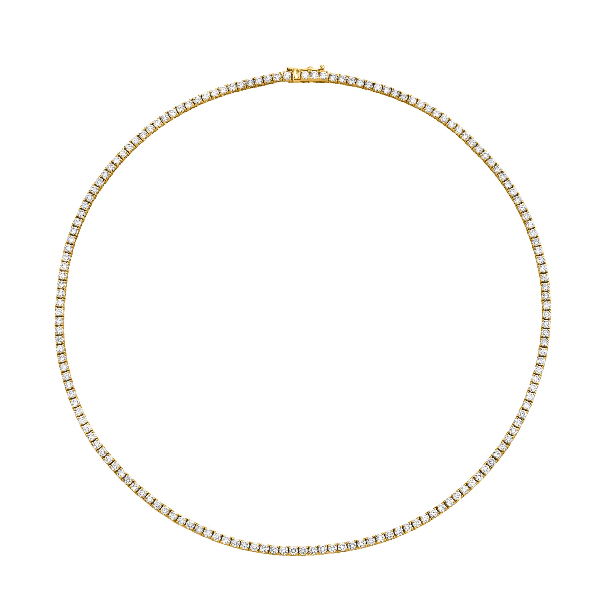 Crafted in luxurious 18k gold, the Straight Line Diamond Necklace exudes timeless elegance. Featuring a continuous line of 1.9mm round diamonds set in 4-prong mountings, this piece adds a sophisticated touch to any ensemble, making it a perfect choice for refined luxury and lasting beauty. Approximately 4.90 carat total weight with 179 stones. Available in various metal colors.