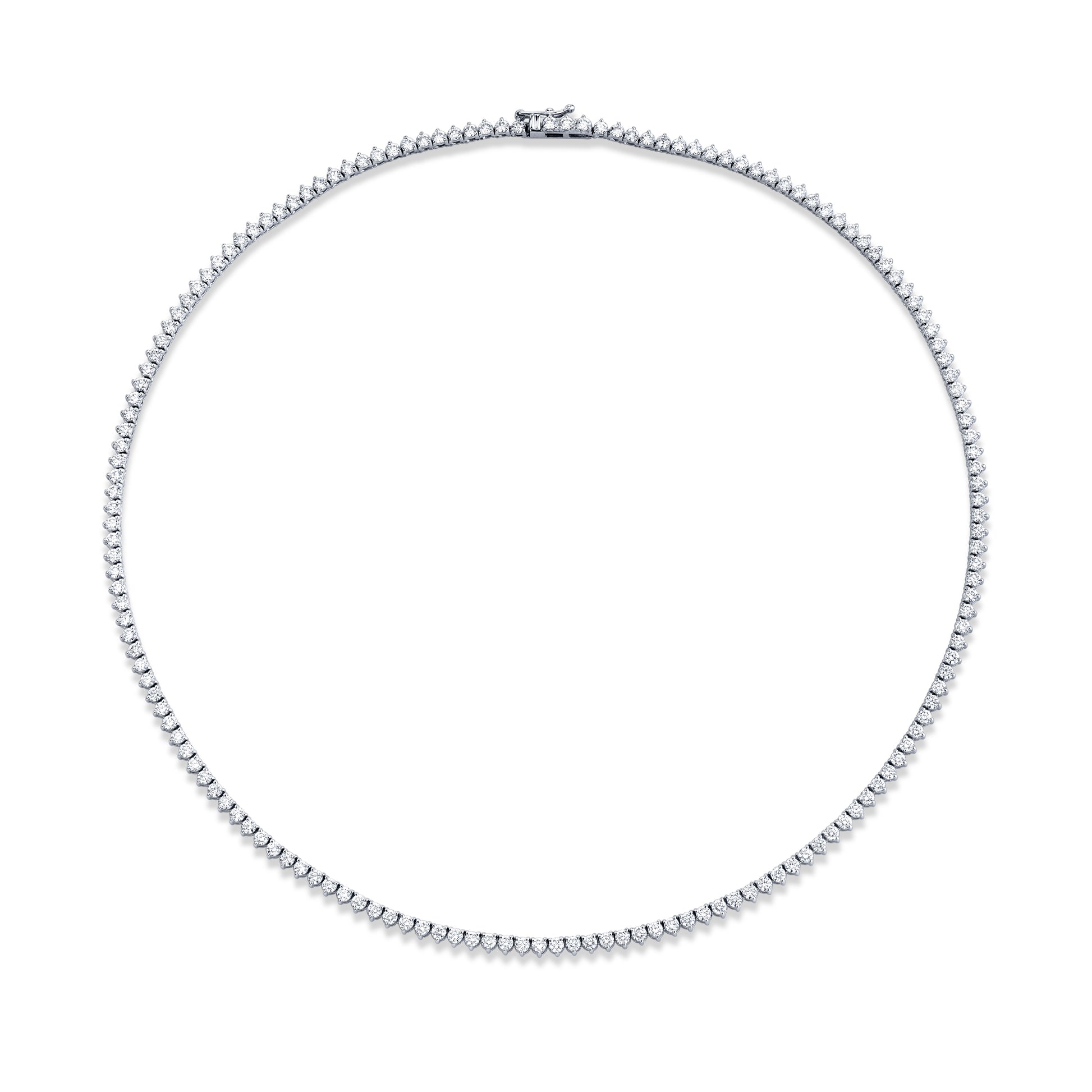 Crafted in luxurious 18k white gold, the Straight Line Diamond Necklace exudes timeless elegance. Featuring a continuous line of 2.2mm round diamonds set in 3-prong mountings, this piece adds a sophisticated touch to any ensemble, making it a perfect choice for refined luxury and lasting beauty. Approximately 6.75 carat total weight.