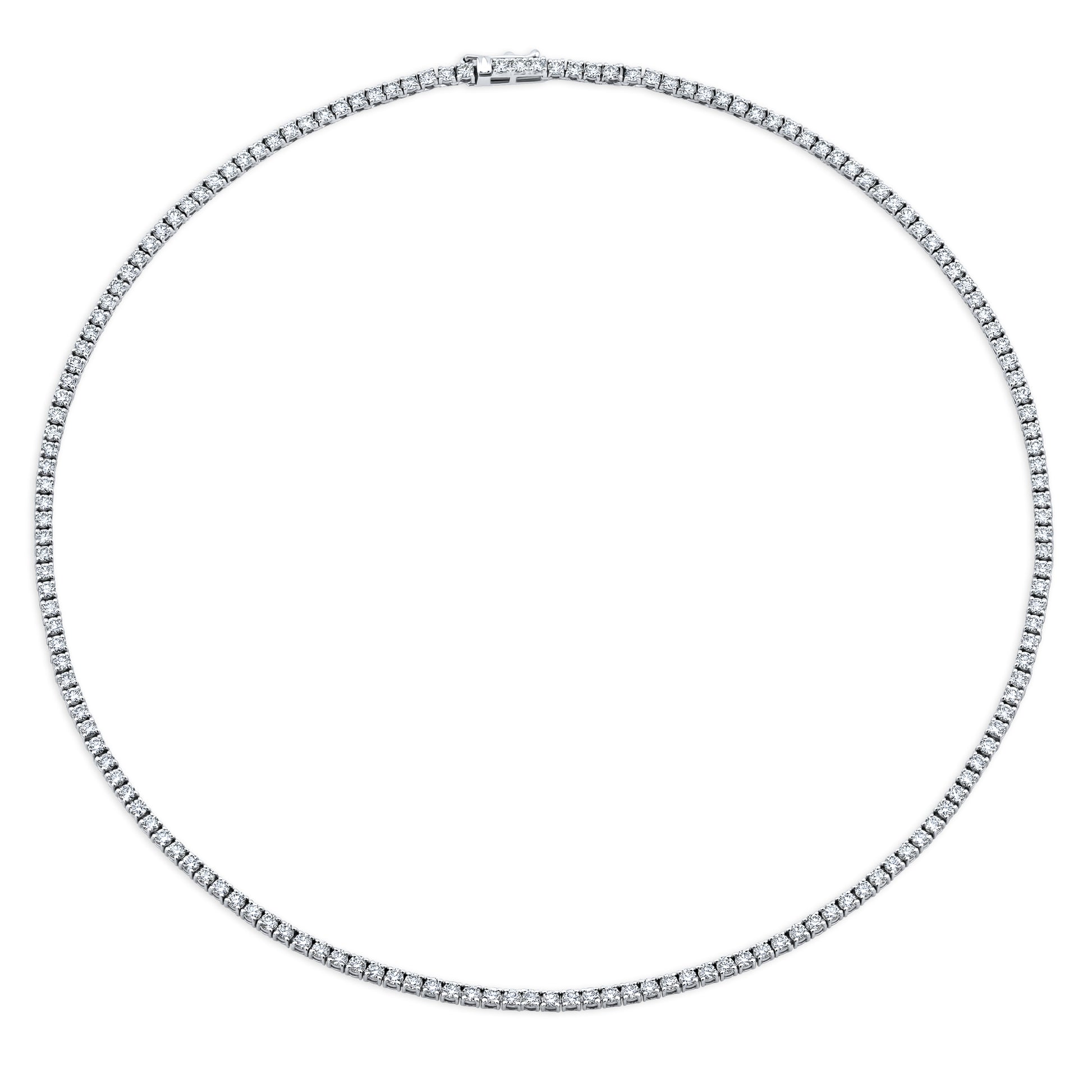 Crafted in luxurious 18k white gold, the Straight Line Diamond Necklace exudes timeless elegance. Featuring a continuous line of 2.2mm round diamonds set in 4-prong mountings, this piece adds a sophisticated touch to any ensemble, making it a perfect choice for refined luxury and lasting beauty. Approximately 7.00 carat total weight.
