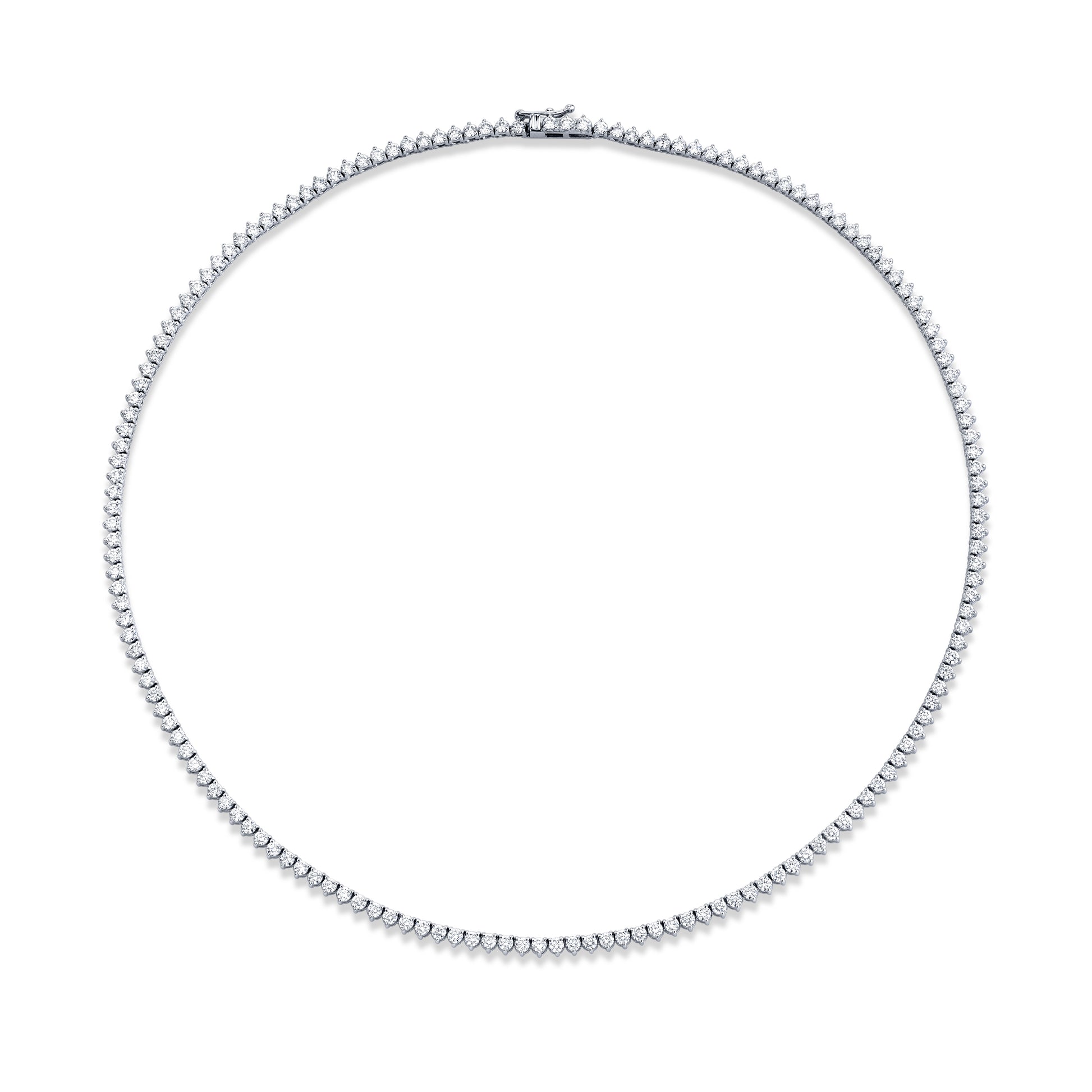 Crafted in luxurious 18k white gold, the Straight Line Diamond Necklace exudes timeless elegance. Featuring a continuous line of 2.5mm round diamonds set in 3-prong mountings, this piece adds a sophisticated touch to any ensemble, making it a perfect choice for refined luxury and lasting beauty. Approximately 9.00 carat total weight.