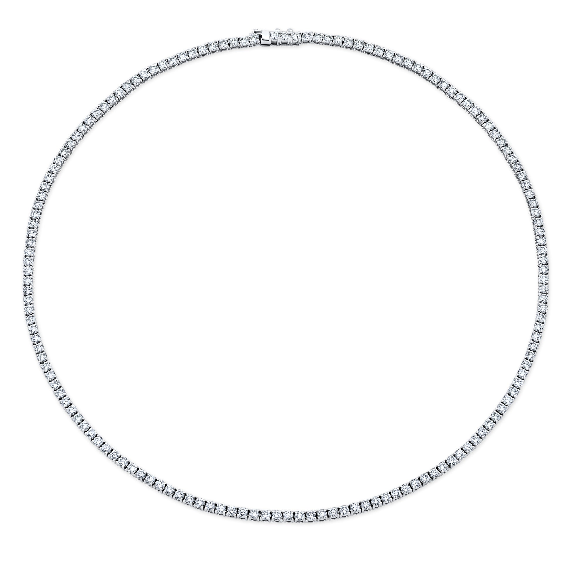 Crafted in luxurious 18k white gold, the Straight Line Diamond Necklace exudes timeless elegance. Featuring a continuous line of 2.5mm round diamonds set in 4-prong mountings, this piece adds a sophisticated touch to any ensemble, making it a perfect choice for refined luxury and lasting beauty. Approximately 9.00 carat total weight.