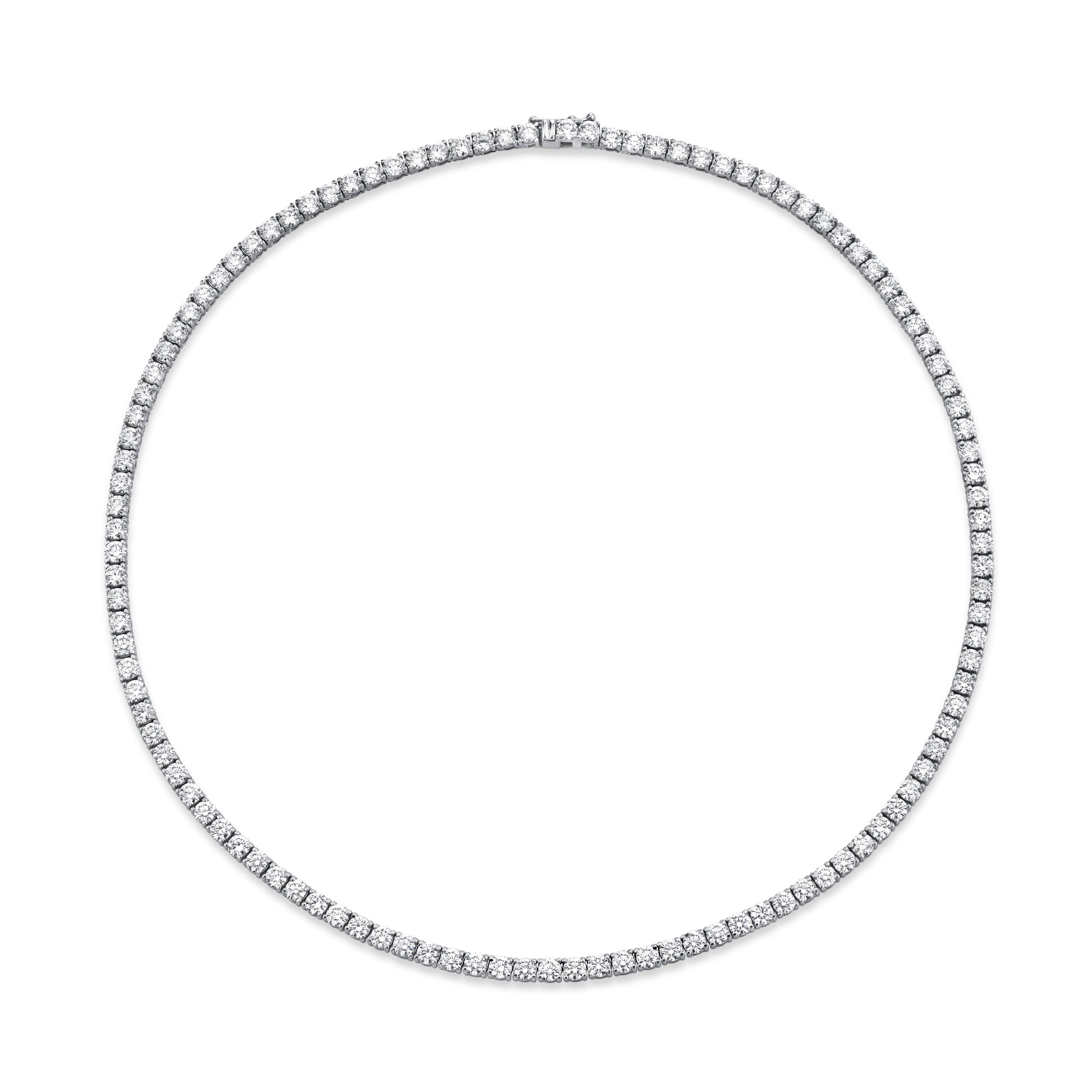Crafted in luxurious 18k white gold, the Straight Line Diamond Necklace exudes timeless elegance. Featuring a continuous line of 3.5mm round diamonds set in 4-prong mountings, this piece adds a sophisticated touch to any ensemble, making it a perfect choice for refined luxury and lasting beauty. Approximately 17.00 carat total weight.