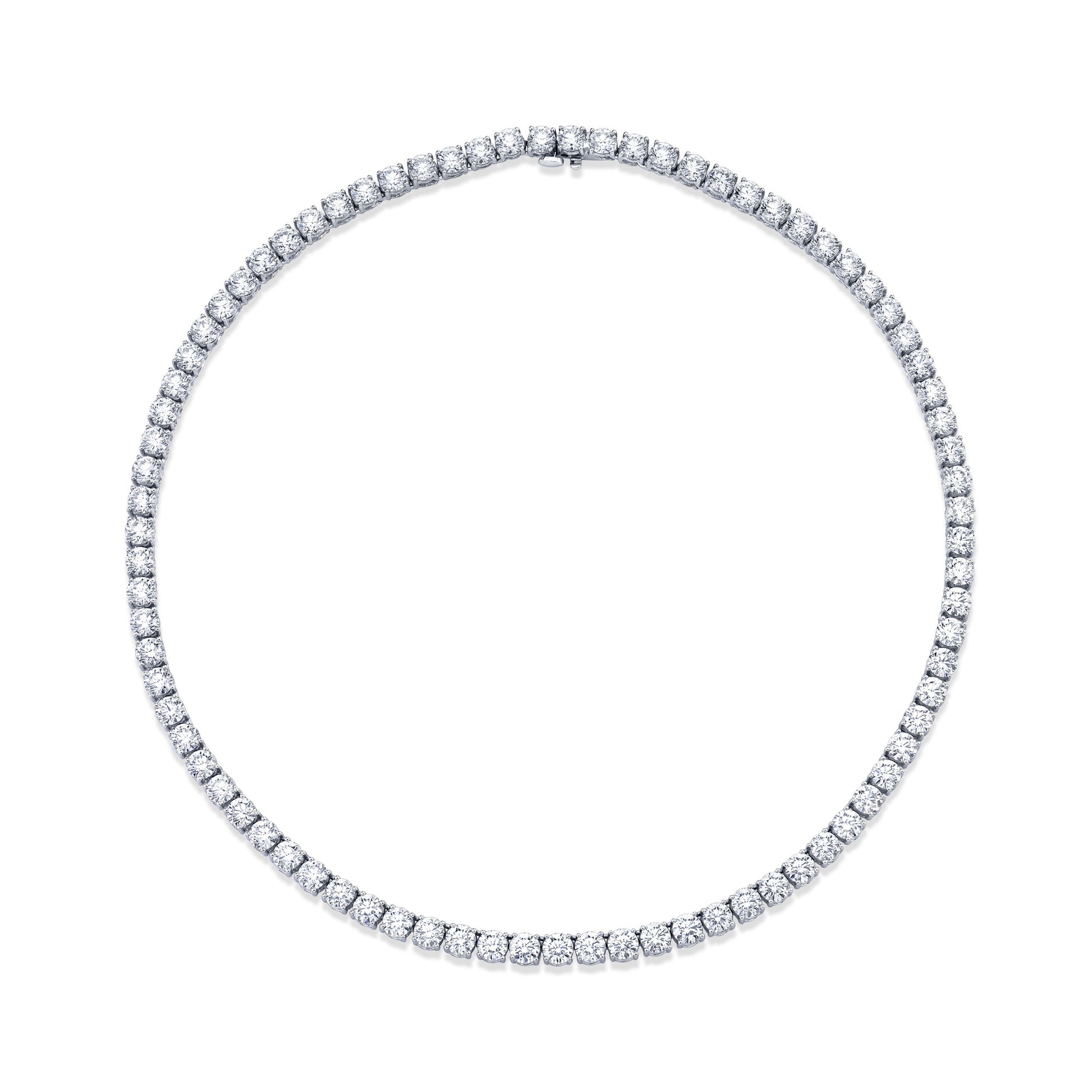 Crafted in luxurious 18k white gold, the Straight Line Diamond Necklace exudes timeless elegance. Featuring a continuous line of 4.0mm round diamonds set in 4-prong mountings, this piece adds a sophisticated touch to any ensemble, making it a perfect choice for refined luxury and lasting beauty. Approximately 24.00 carat total weight.