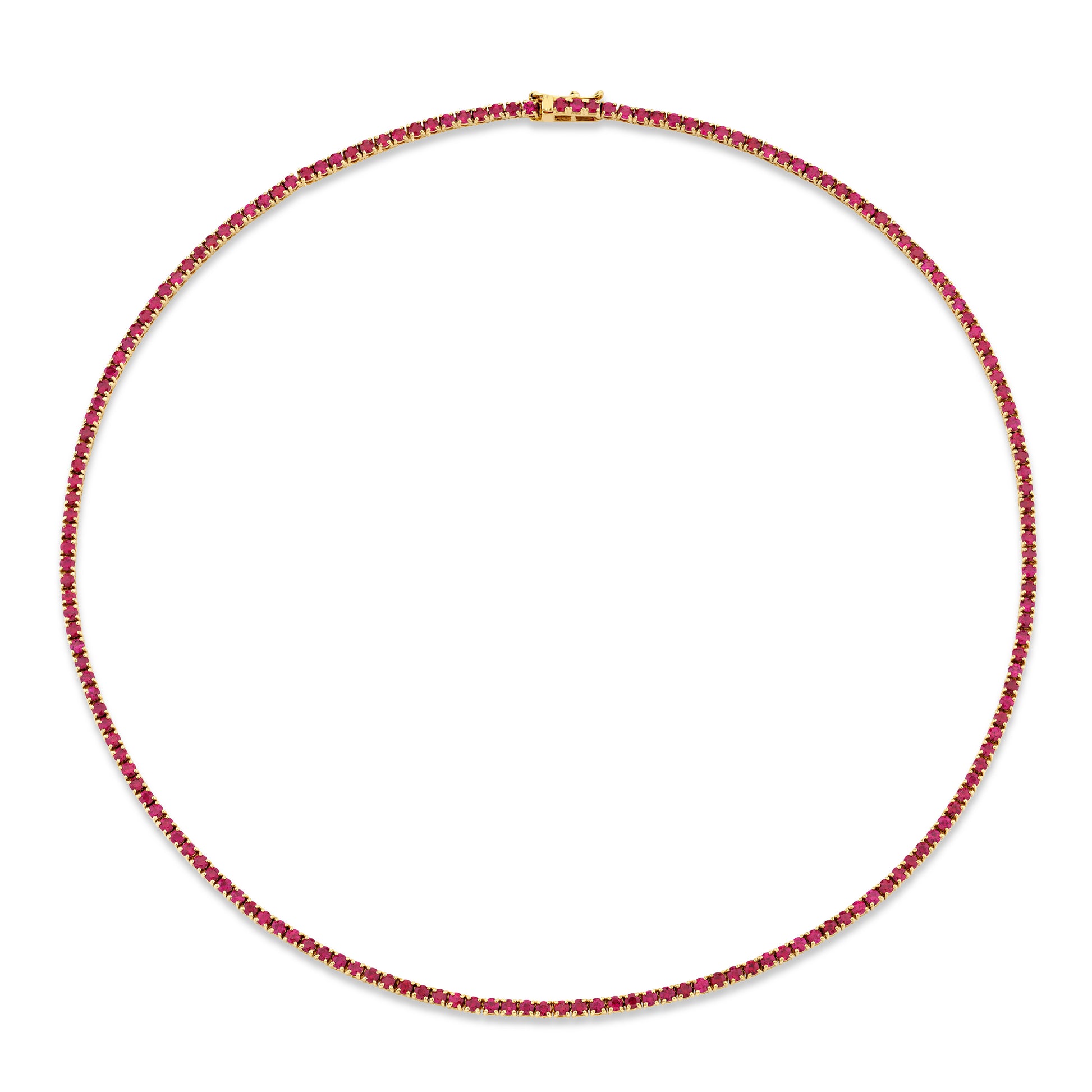 This straight line necklace features 6.77 carats of vivid rubies set in 18k yellow gold. A clean, elegant design that lets the richness of the color take center stage.